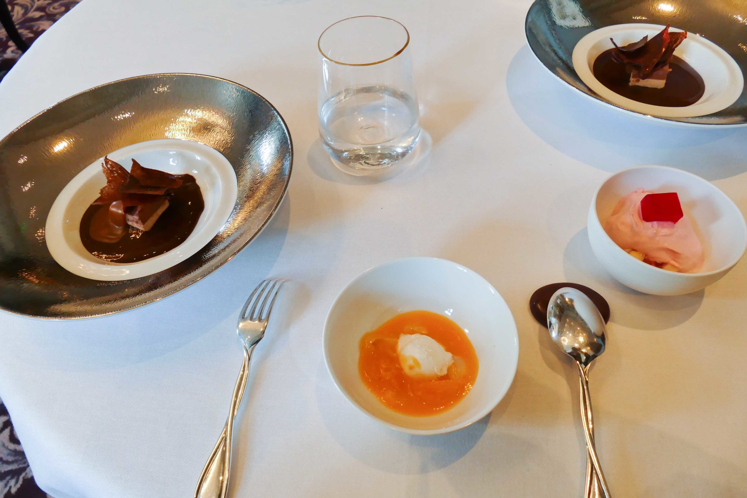 On retrouve de nouveau le style des « assiettes satellites » qui reprennent la version du Grand Dessert avec ce côté insolite qu’affectionne Pierre Gagnaire. Parfois c’est le côté fraîcheur fruitée qui est mis en avant, parfois c’est le côté régressif où flirtent finesse et subtilité, ou encore le chocolat qui offre un joli moment de gourmand et réconfortant.