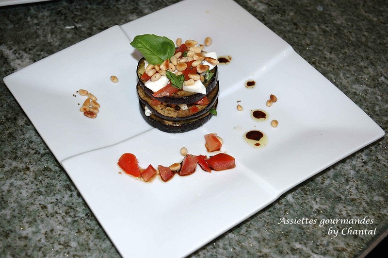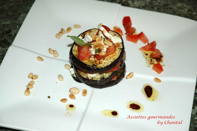 Une aubergine,2 tomates, mozzarella, pignons de pin, basilic,