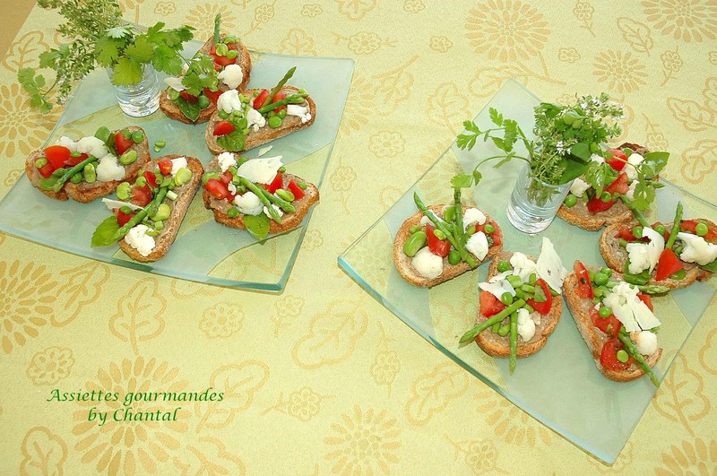 Il s’agit de tranches de pain grillées et tartinées d’anchoïade, surmontées de petits légumes de saison très jeunes et très frais.