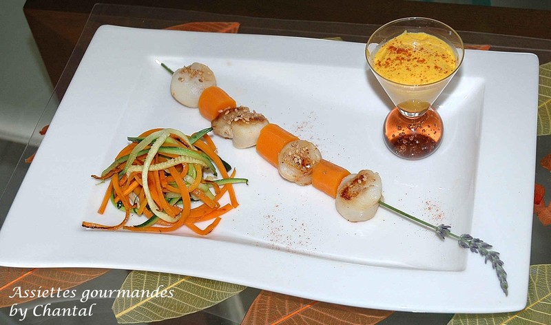 Il s’agit d’une brochette de Saint-Jacques (une tige de lavande faisant office de brochette), accompagné d’une émulsion carotte-cumin (là où intervient mon siphon), et d’une julienne carottes courgettes…ça permet à ma mandoline de prendre l’air également…!