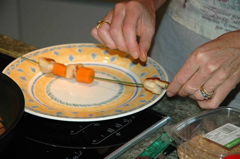 Pour finir, disposer harmonieusement la julienne en accompagnement de la brochette.
