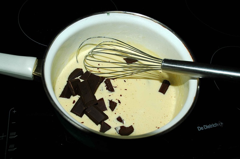 Faire bouillir la crème. Ajouter le chocolat hors du feu.