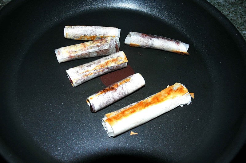 Les rouler en forme de nems avec les framboises et une petite quenelle de ganache collée au jaune d’oeuf.