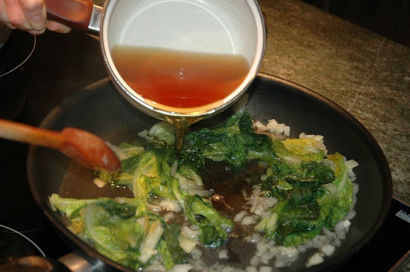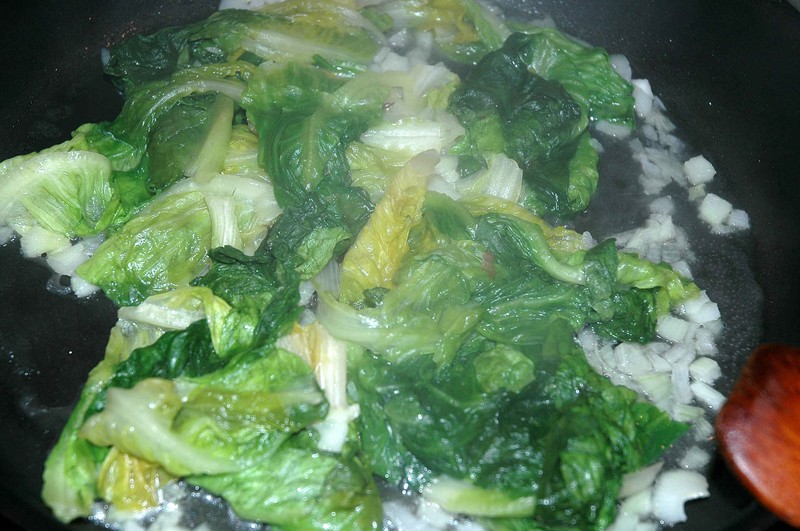 Faire suer un oignon haché avec de l’huile d’olive dans une poêle puis ajouter la laitue.