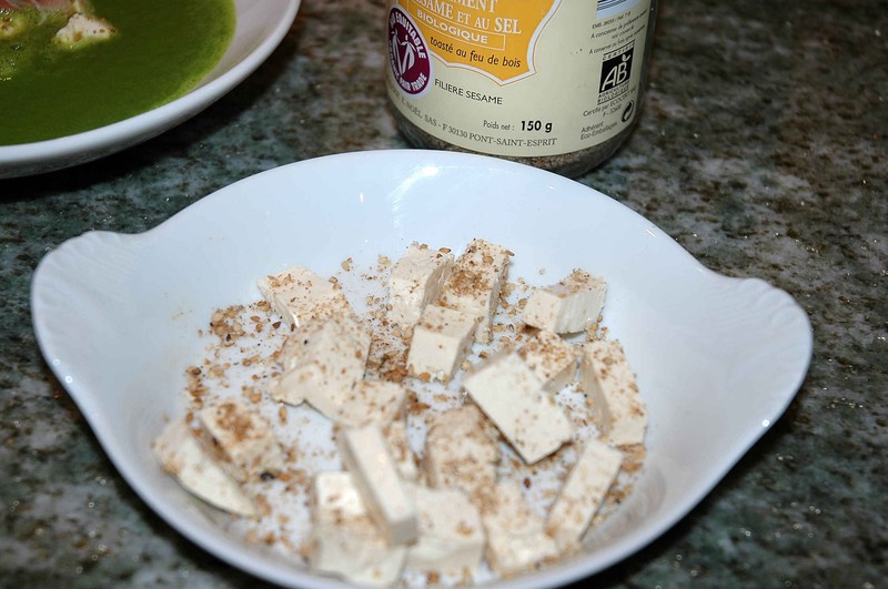 Bouillon de laitue verveine- menthe, tofu au gomasio