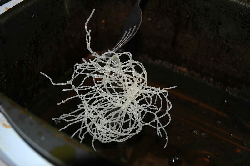 J’ai fait frire des vermicelles de riz par petits paquets pour obtenir un petit croustillant.