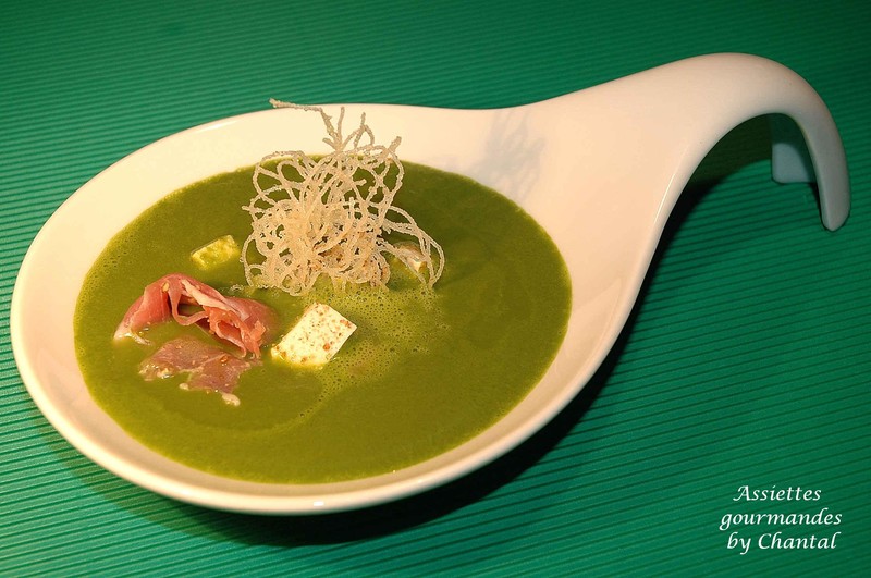 Il s’agit d’une recette inspirée des « Epicuriens du Marais », légèrement modifiée en fonction des ingrédients disponibles dans le frigo…J’ai remplacé les filets de caille prévus initialement par un peu de jambon Serrano et ajouté un peu de menthe à l’infusion.
