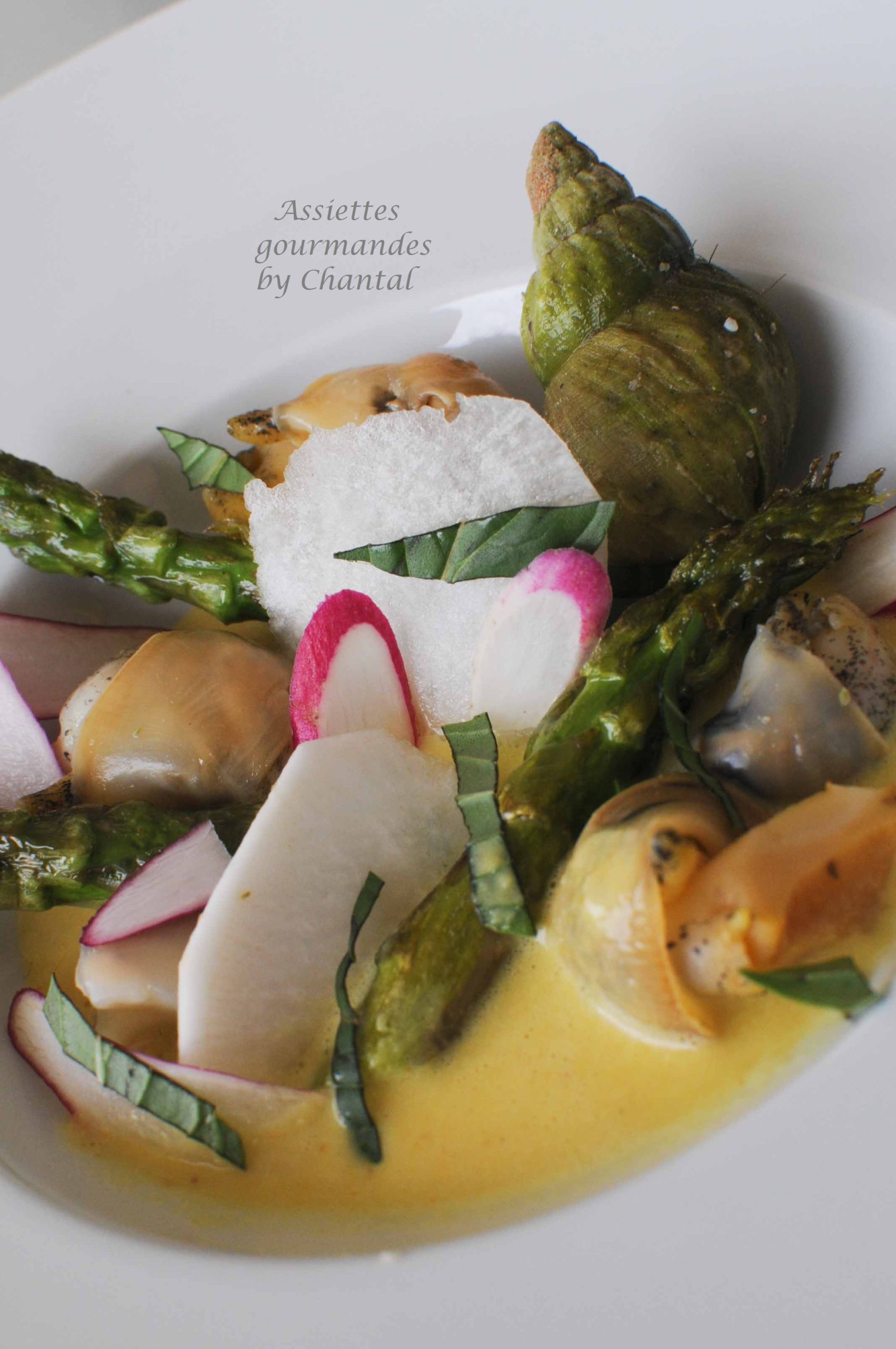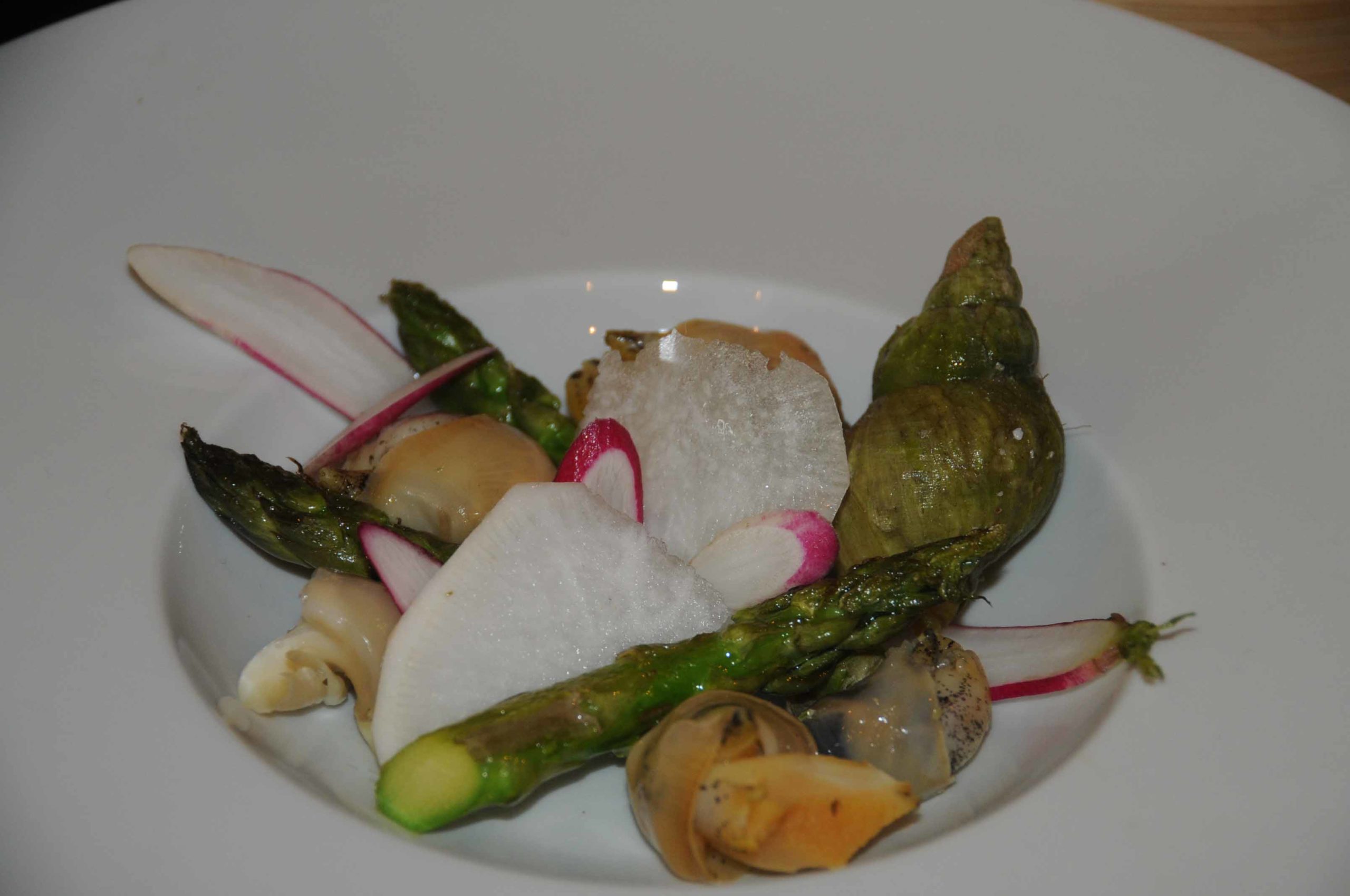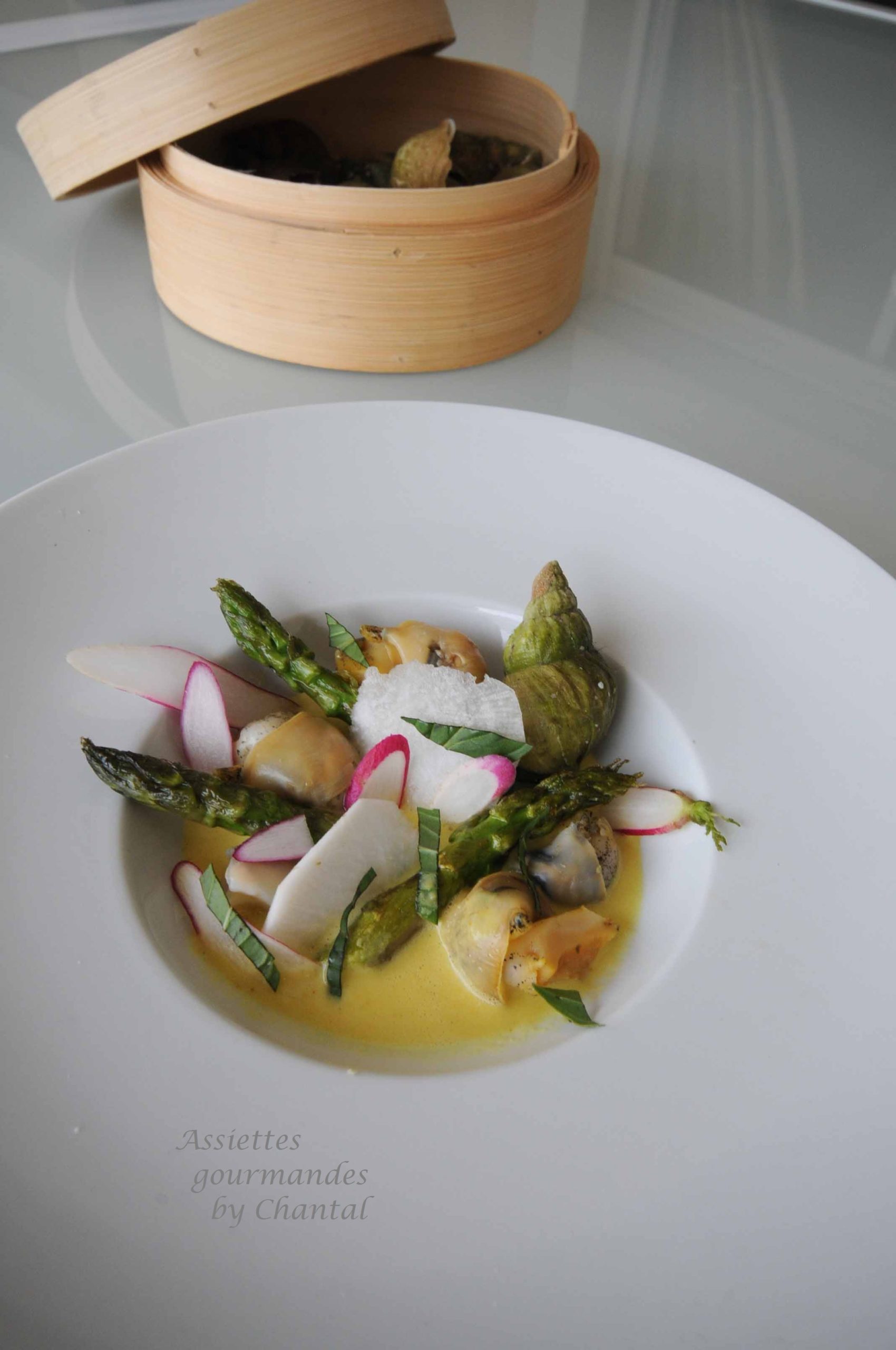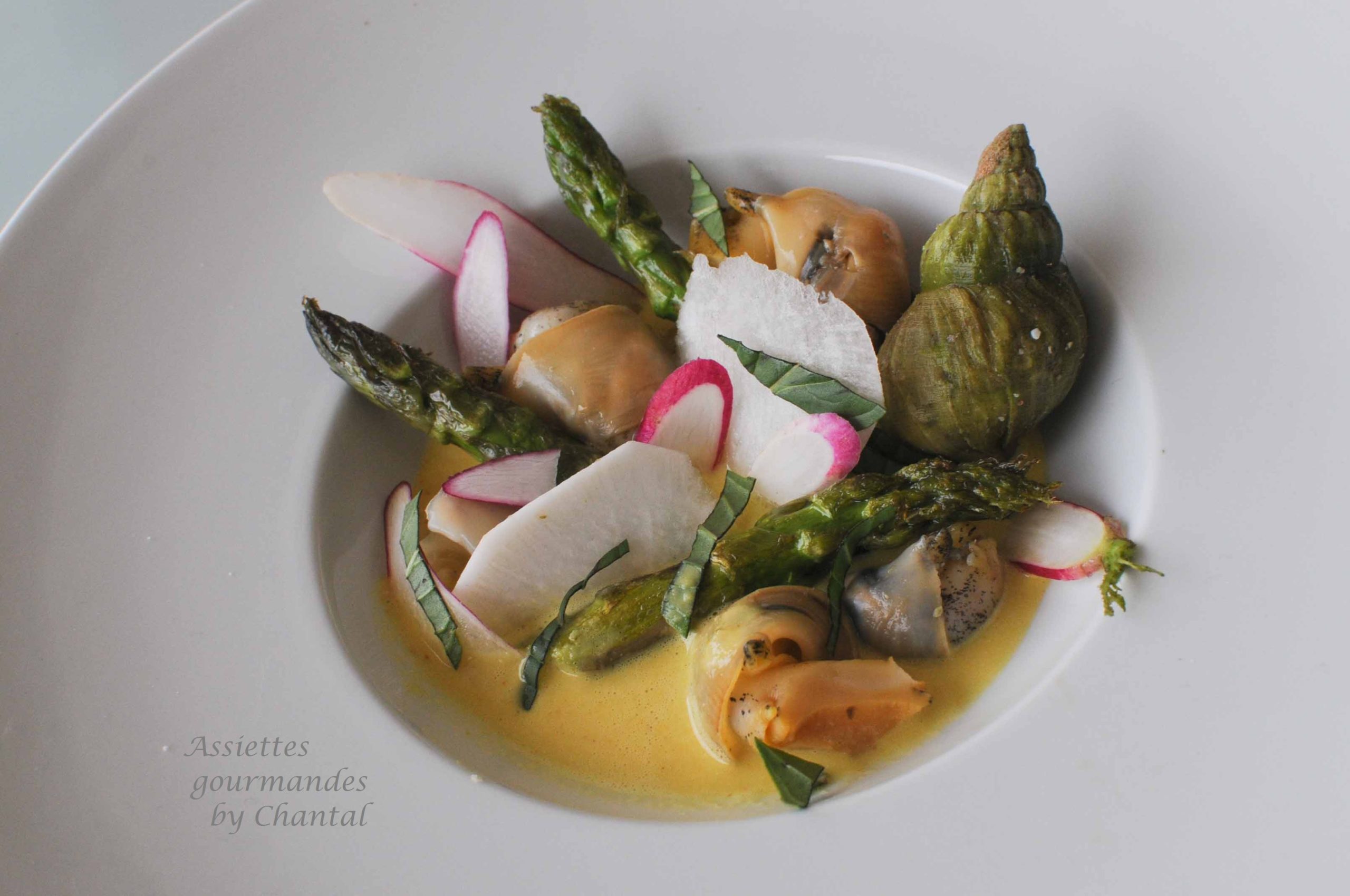 Répartir les bulots dans des assiettes; ajouter quelques asperges, 2 cuillerées d’aïoli gingembre citronnelle, les lamelles de radis lustrées à l’huile d’olive et des feuilles de basilic thaï ciselées.