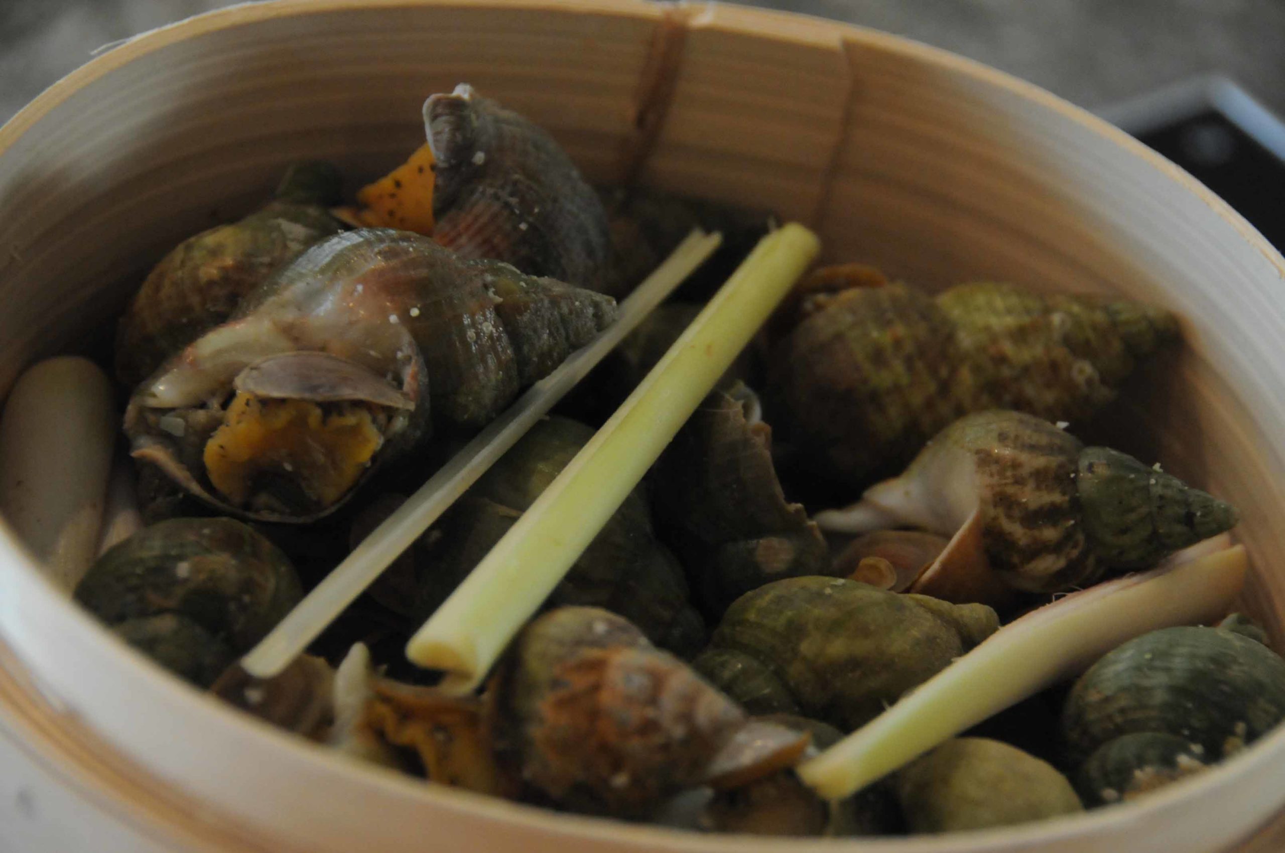 Après avoir rincé les bulots dans de l’eau froide, les placer dans un panier à vapeur avec les tiges de citronnelle coupées en 2.