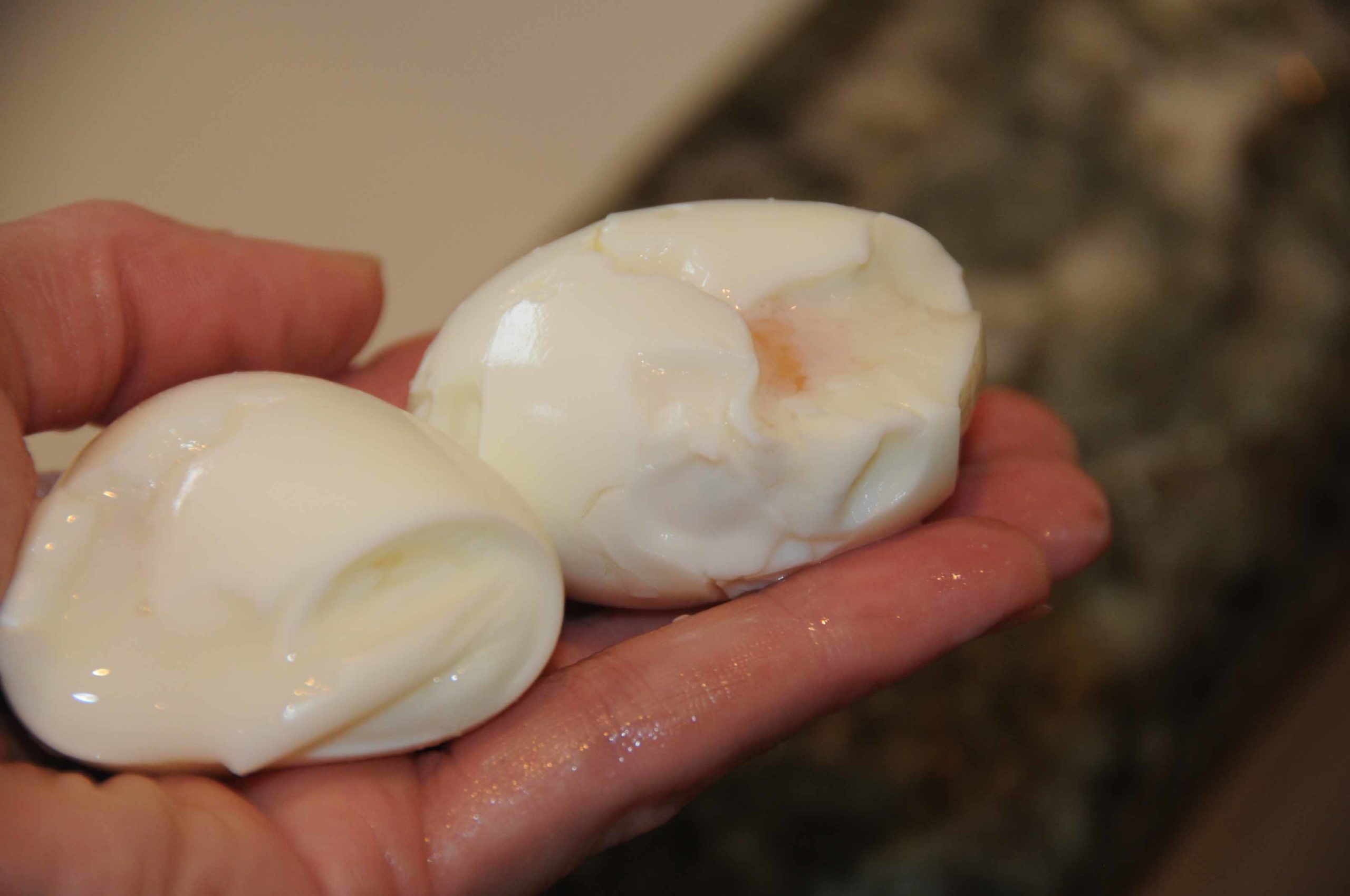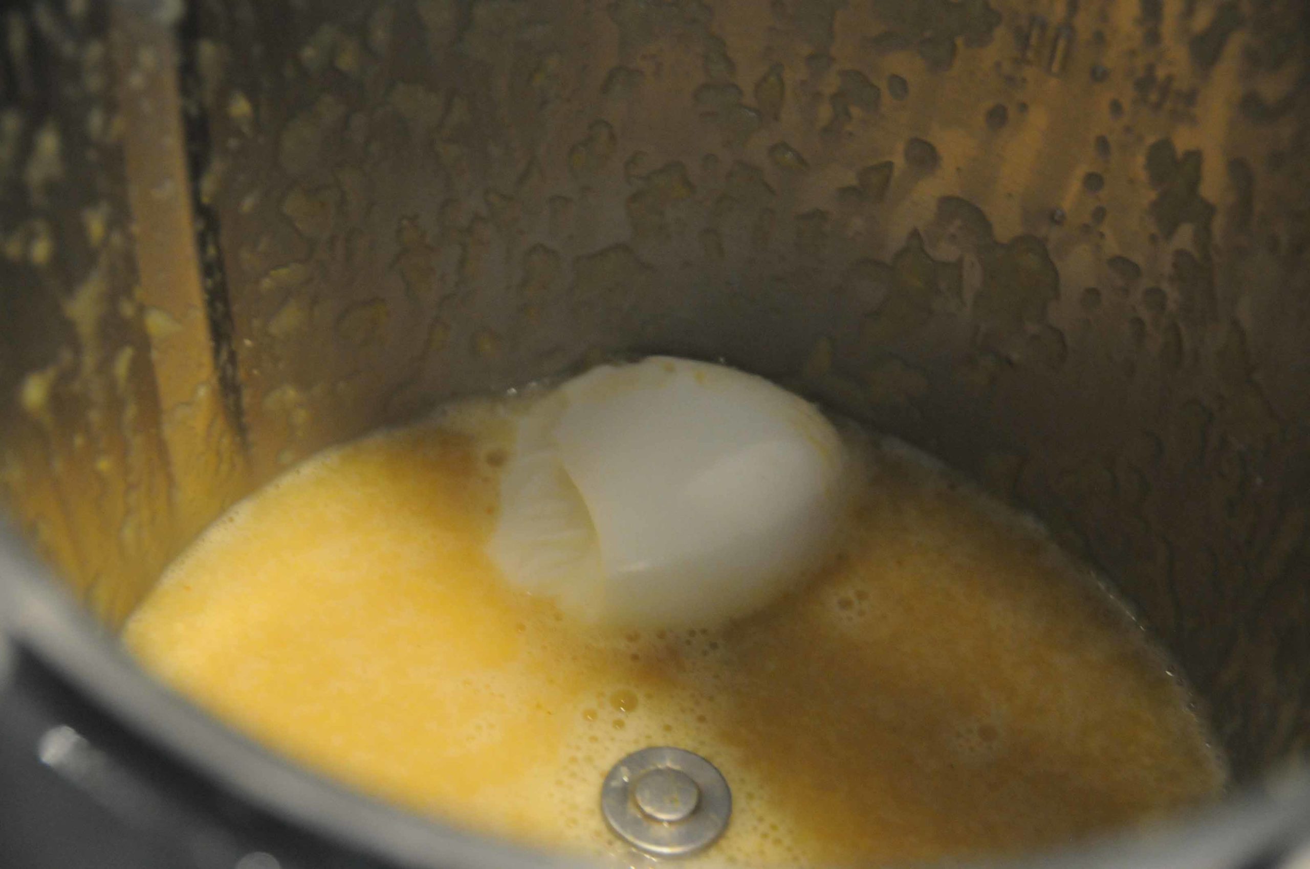 Porter à ébullition et cuire environ 20 minutes. Mixer ce bouillon en incorporant le jus des citrons, le vinaigre de gingembre et le gingembre mariné, les oeufs mollets (cuits au préalable 5 minutes dans une casserole d’eau à petite ébullition), le safran et une cuillerée de moutarde japonaise. Mixer finement, assaisonner. (J’ai fait tout cela au Thermomix). Incorporer progressivement l’huile d’olive et filtrer si nécessaire.