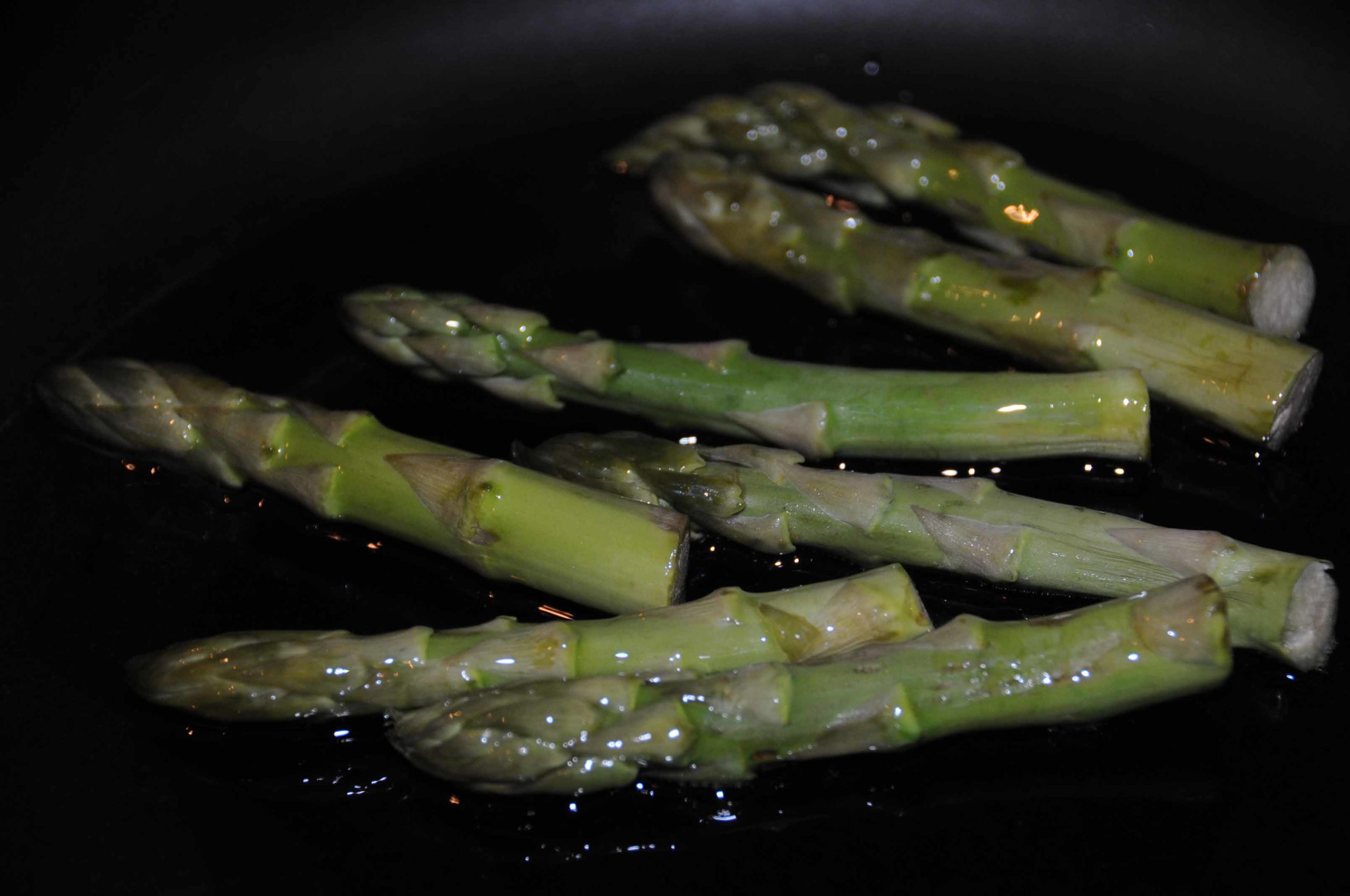 Nettoyer les têtes d’asperges; faire chauffer l’huile d’olive dans une sauteuse et cuire les têtes d’asperges pendant 3 minutes, elles doivent rester croquantes.