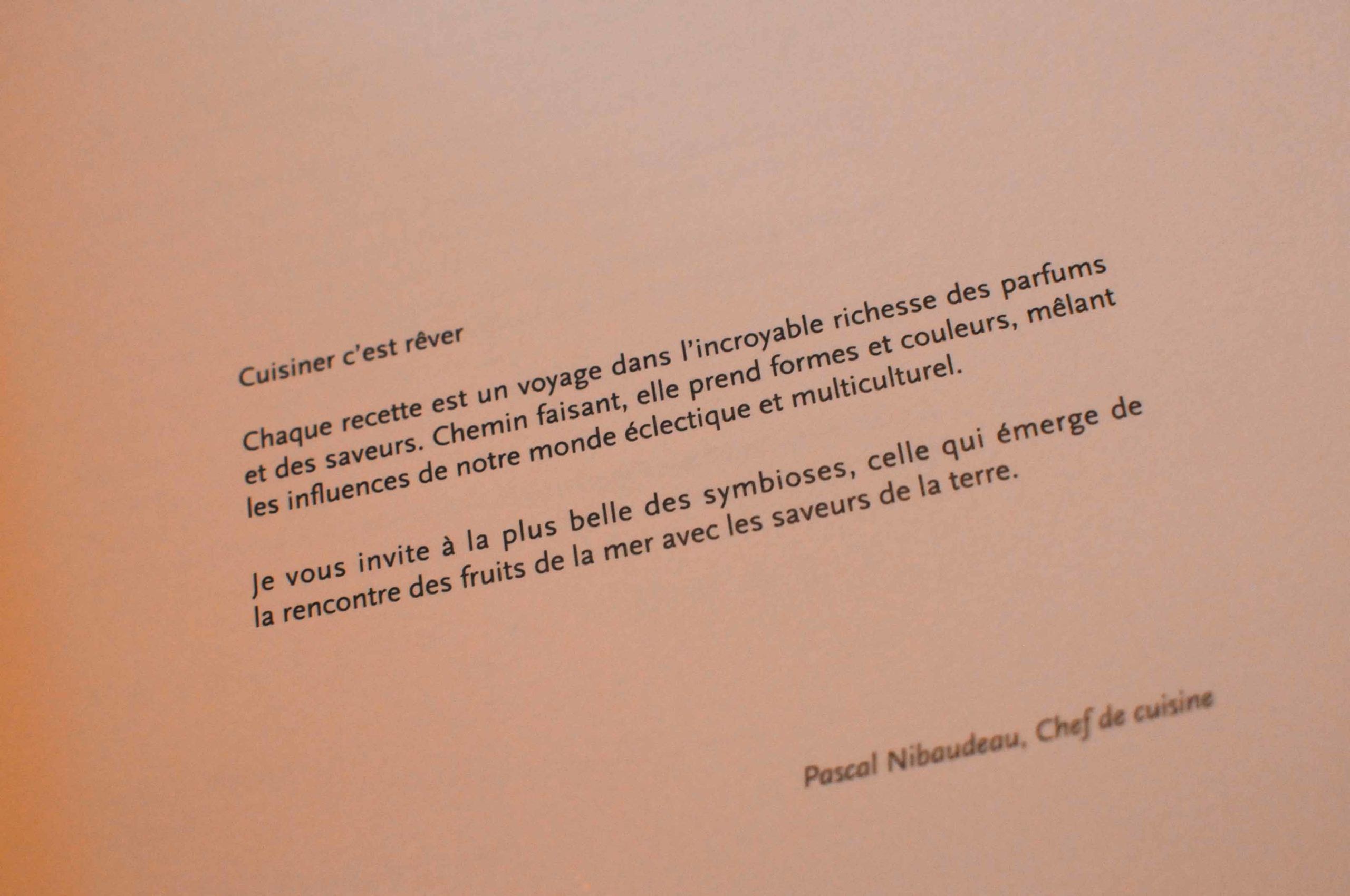 Pendant que le défilé des mises en bouches s’organise, Pascal Nibaudeau vient nous expliquer sa carte, et on choisit ensemble les plats d’un Menu « personnalisé », avec comprenant plusieurs réalisations que l’on trouve à sa Carte.