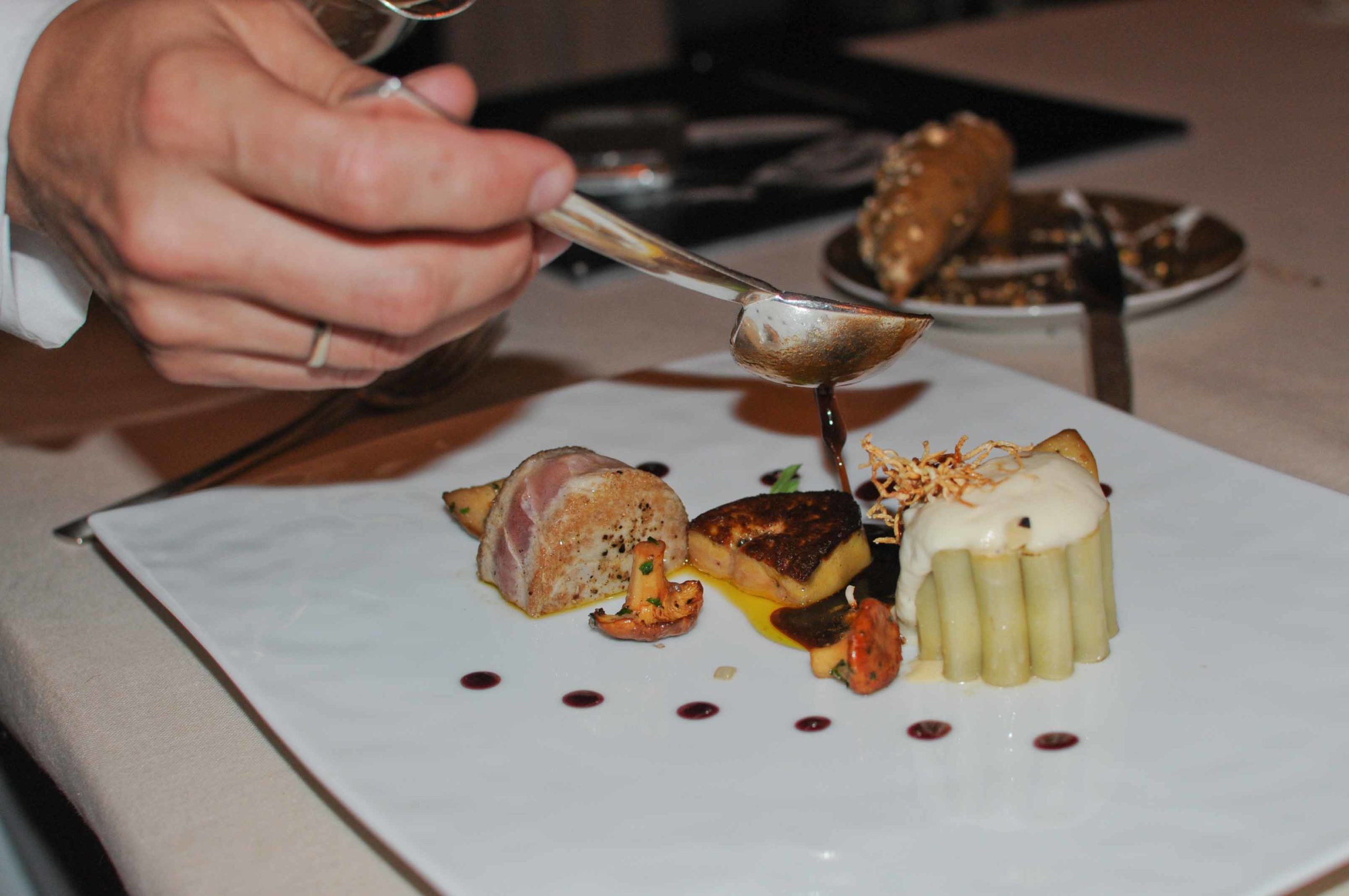 Le thon rouge est juste snacké, le foie gras poêlé, les macaronis sont farcis d’un mélange truffe, champignons, céleri rave puis recouverts d’une mousseline au céleri finition comme un soufflé. Un jus périgourdin à la truffe apporte une puissance supplémentaire au plat.