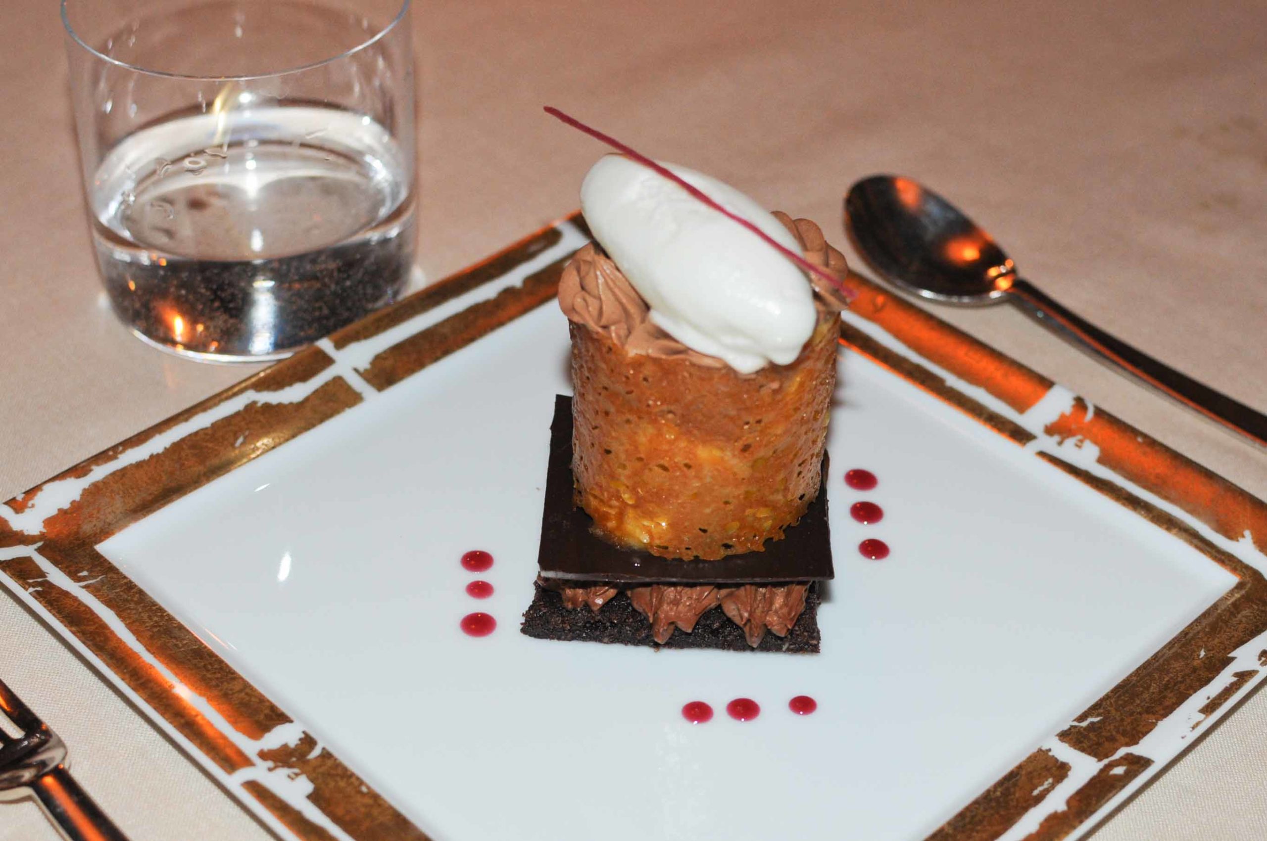 L’eau de tomate est gélifiée mais encore tremblotante , le tartare de bar / huître est très frais, le coulis de vodka et la quenelle de caviar en parfaite harmonie … l’ensemble est à déguster avec une gaufre aux algues qui renforce le côté marin de cette entrée.