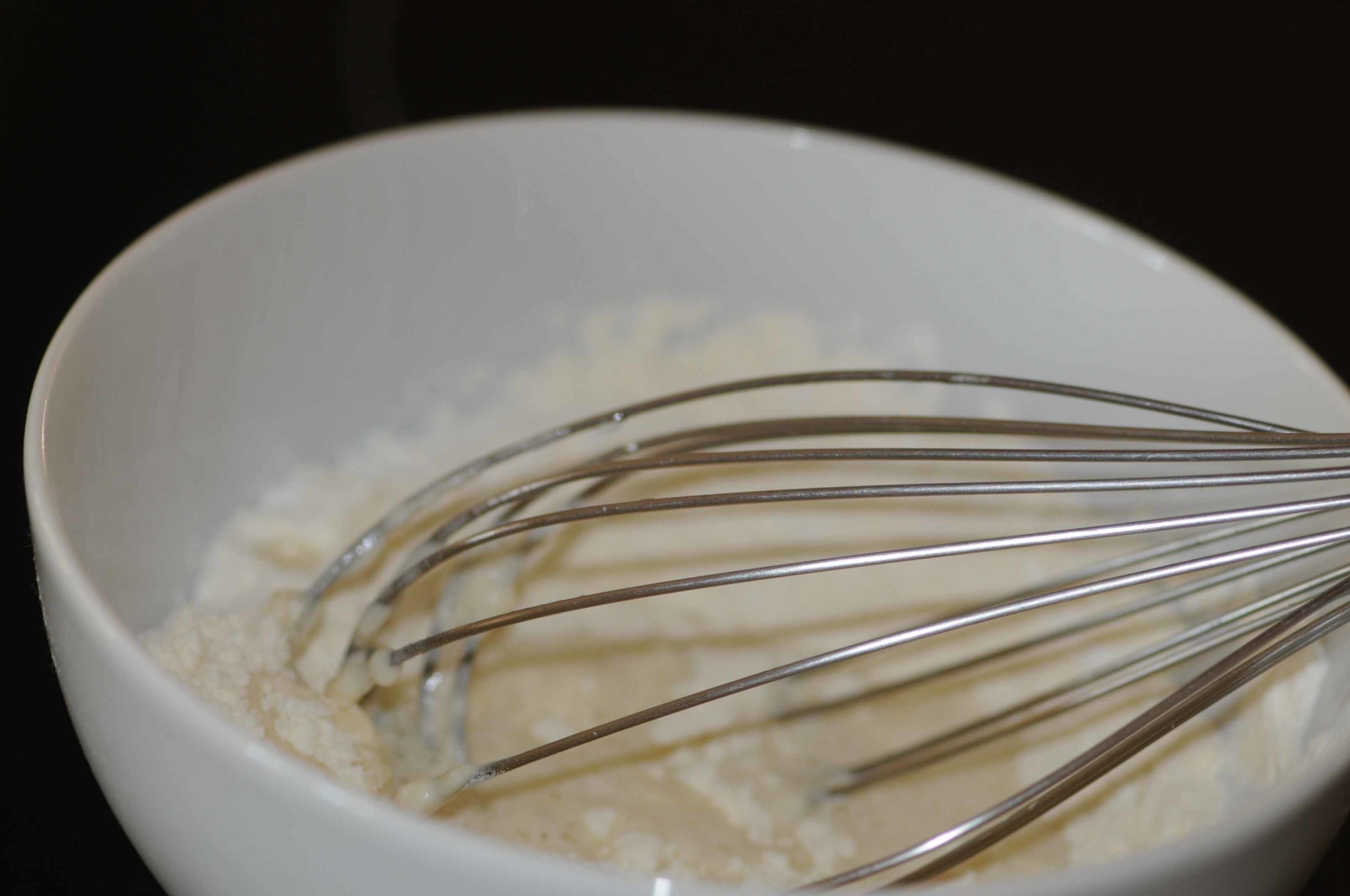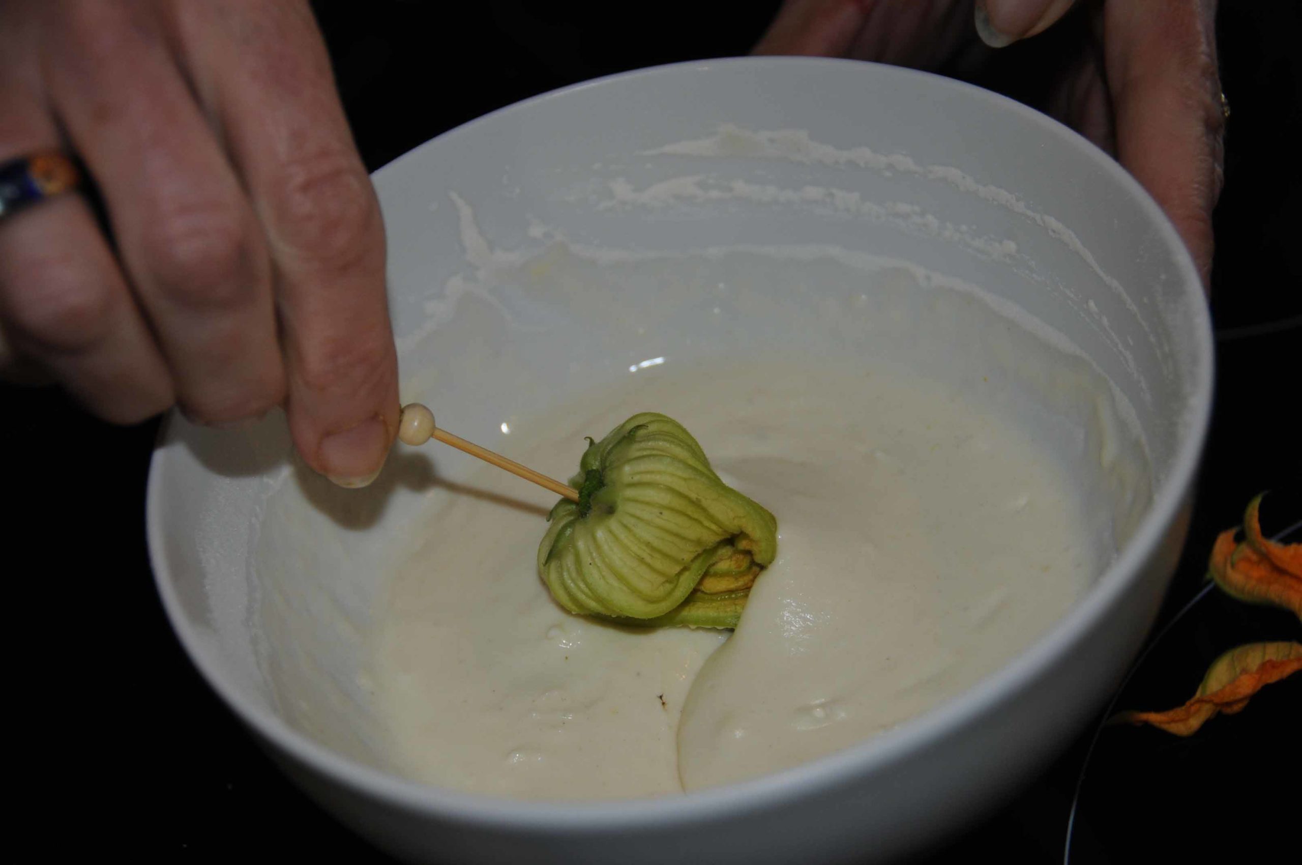 Tempura: 5 fleurs de courgettes, 60 g de farine de blé, 40 g de farine de riz, 10 cl d’eau gazeuse pétillante très froide, une pincée de sel