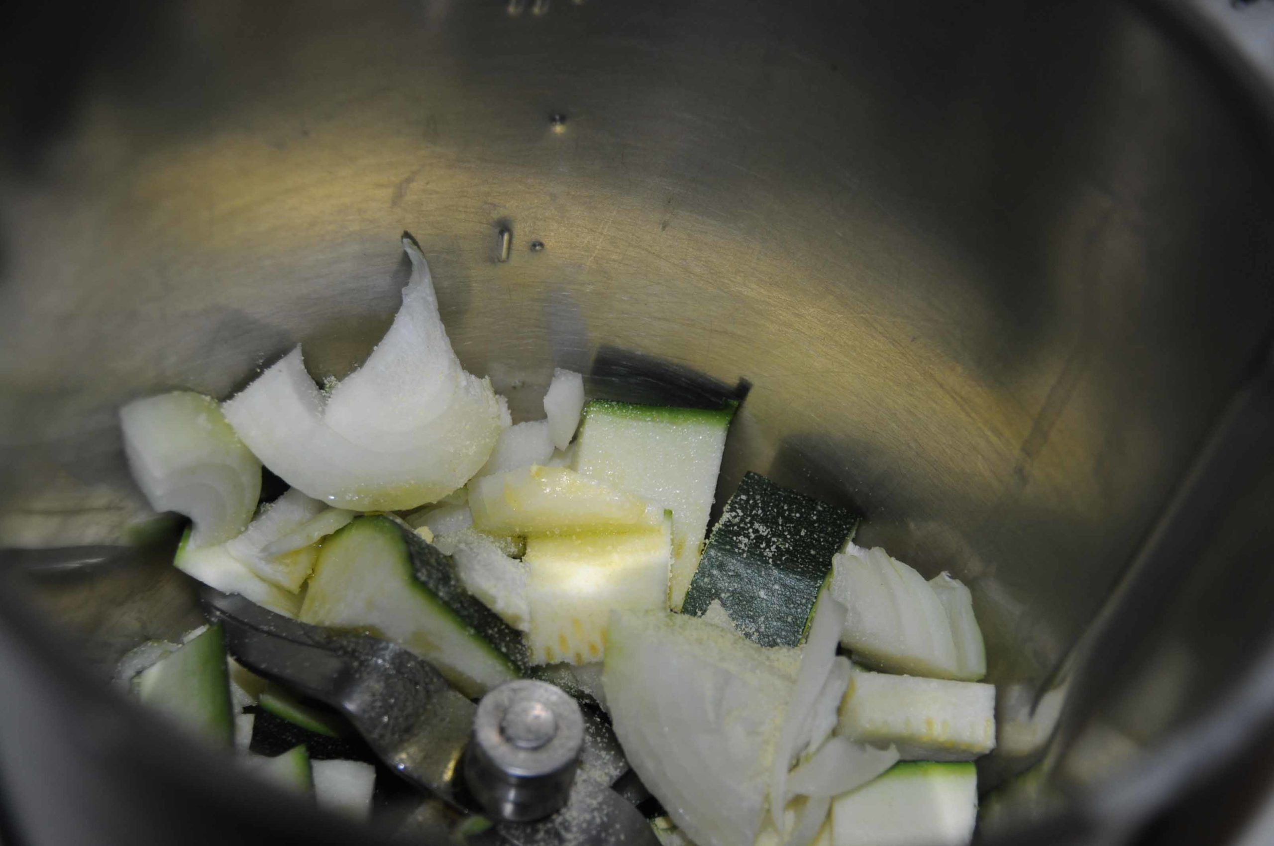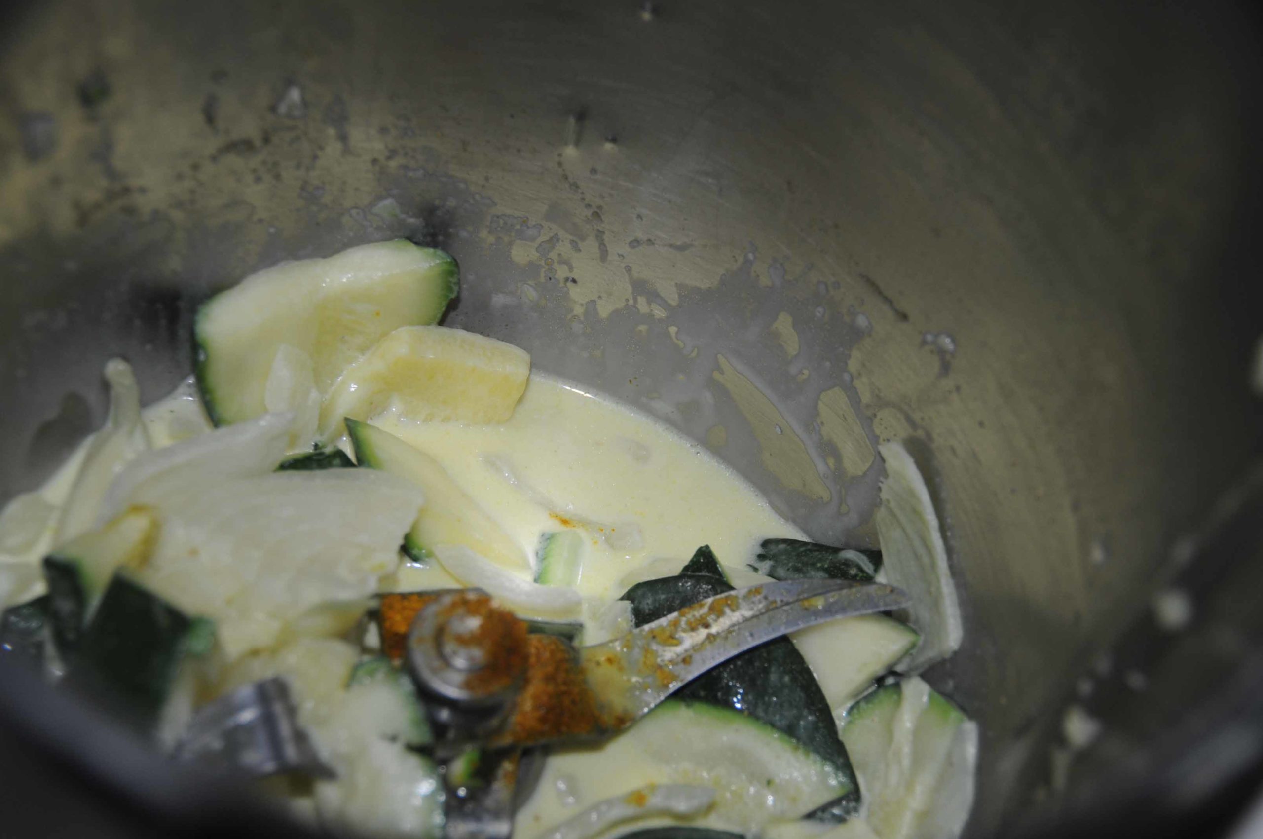 Velouté: 1 courgette, 1/2 oignon, 10 cl de bouillon de volaille, 10 cl de crème liquide, huile d’olive, curry, sel et poivre