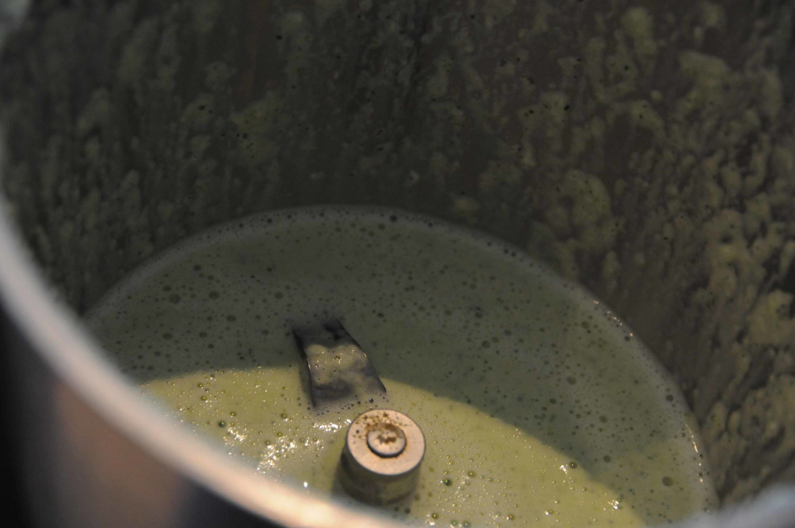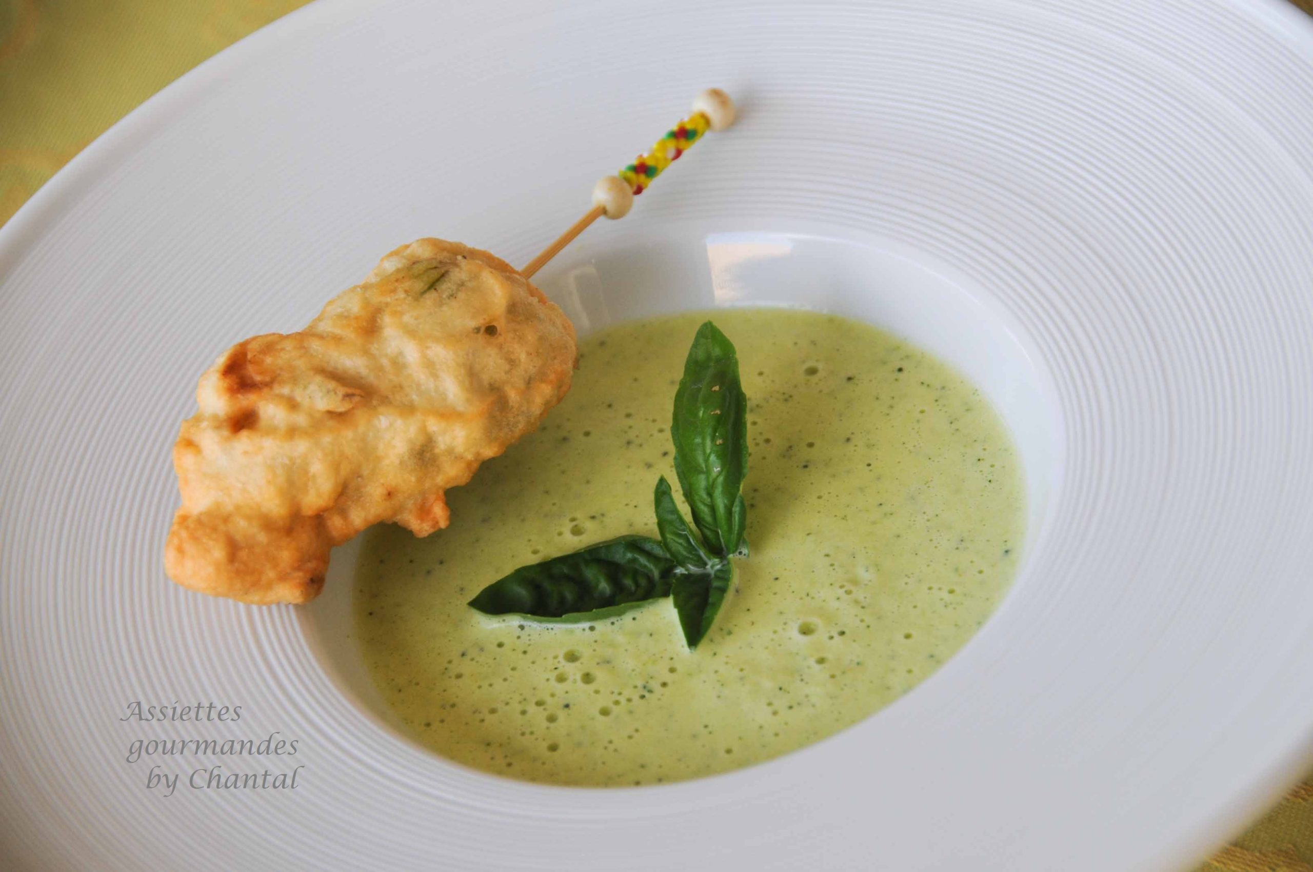 Qui dit fleur de courgette, dit courgette… un petit velouté chaud ou froid à la courgette servira d’ accompagnement à une fleur de courgette délicatement emprisonnée dans sa coque en tempura: