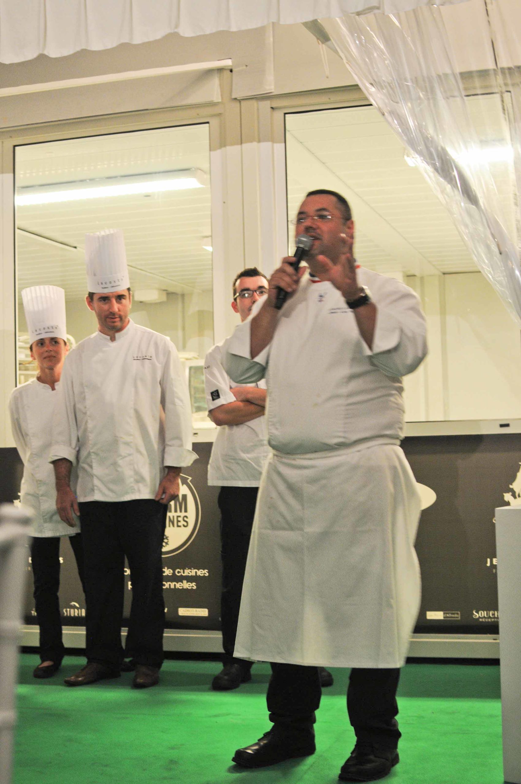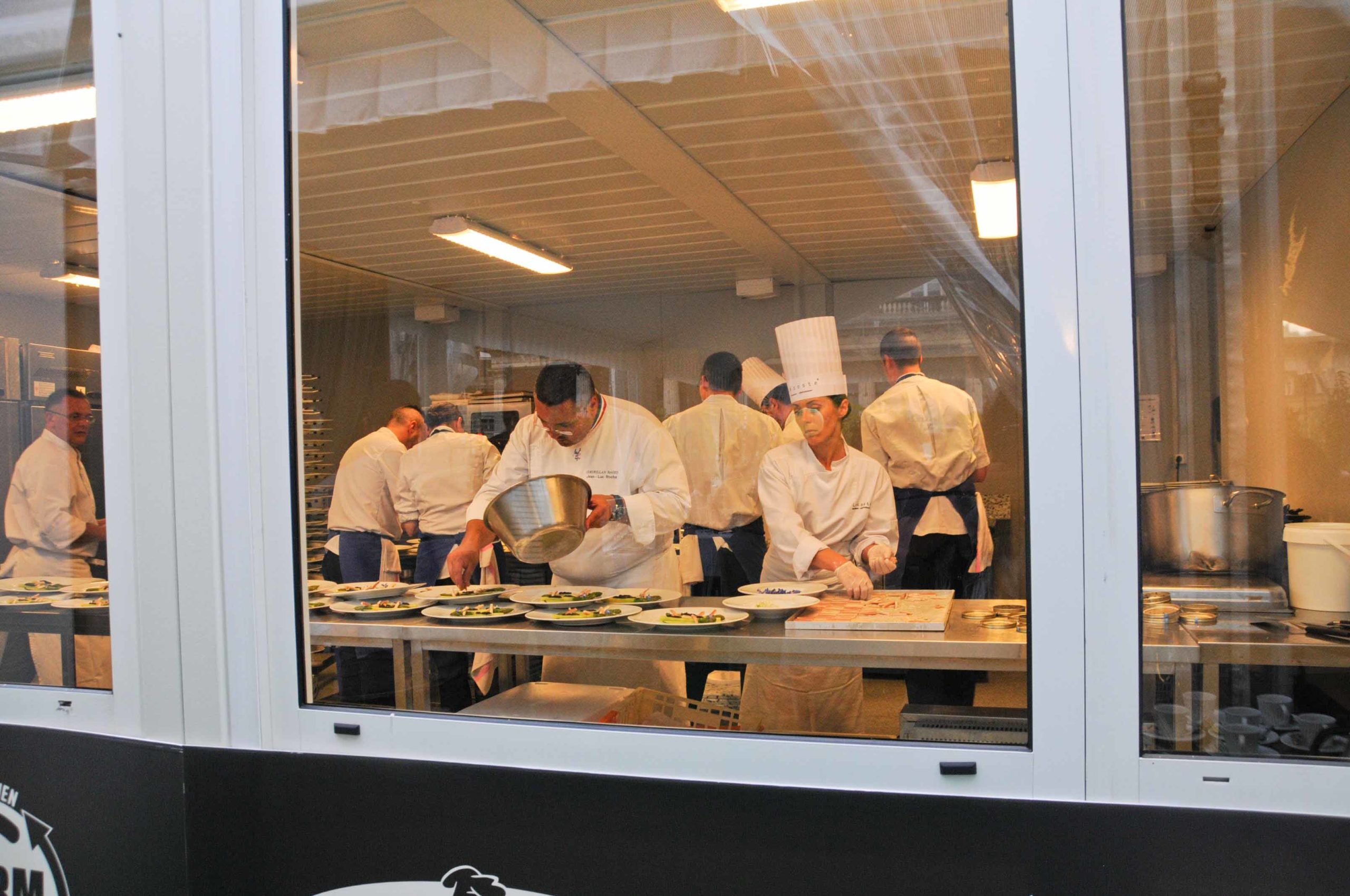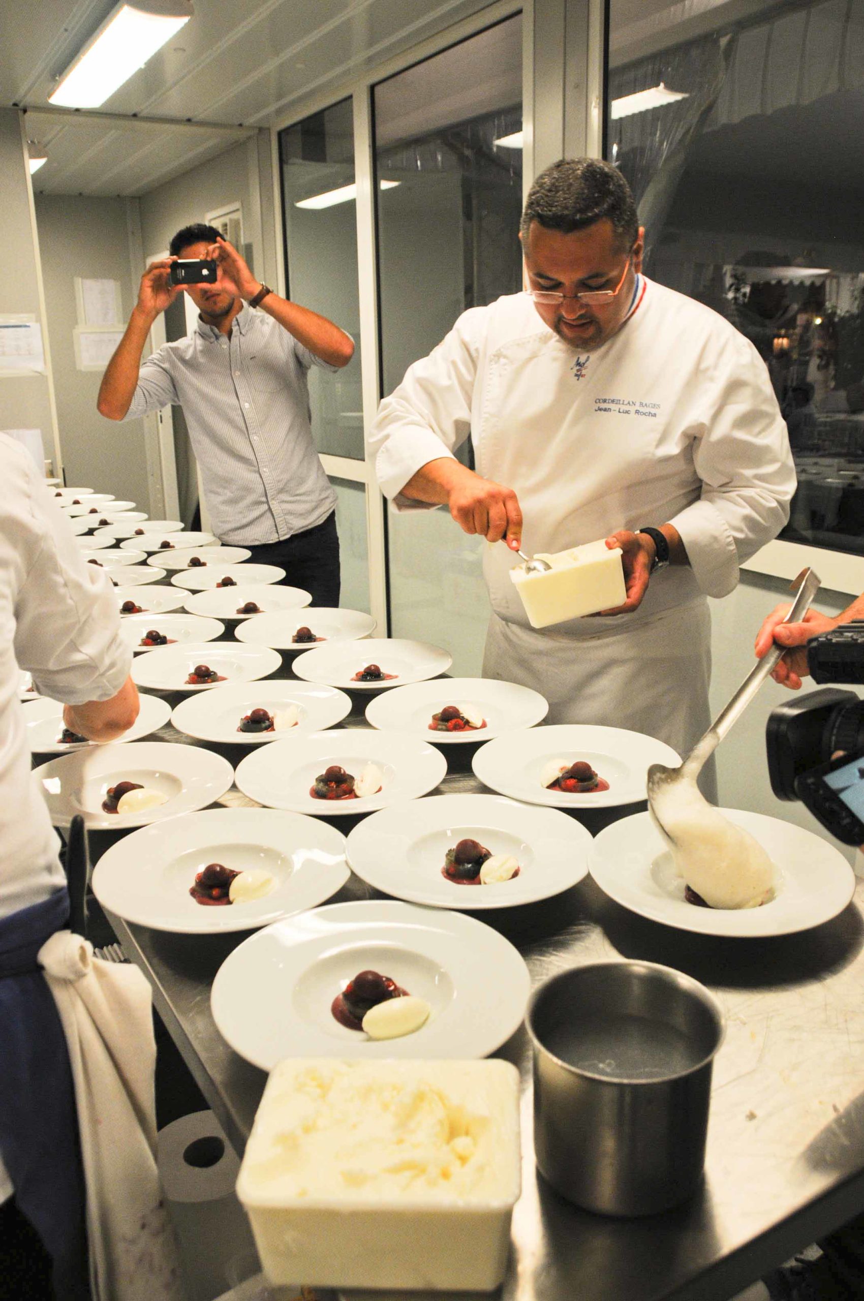 On retrouve le Chef dans les cuisines spécialement aménagées aux Etoiles d’Epicure sur les Allées de Tourny. Petite nouveauté par rapport aux années précédentes: cette année une grande baie vitrée a été installée entre la salle et la cuisine, ce qui permet aux nombreux convives (plus de 100) d’admirer Jean Luc Rocha et les autres cuisiniers s’affairer en cuisine:
