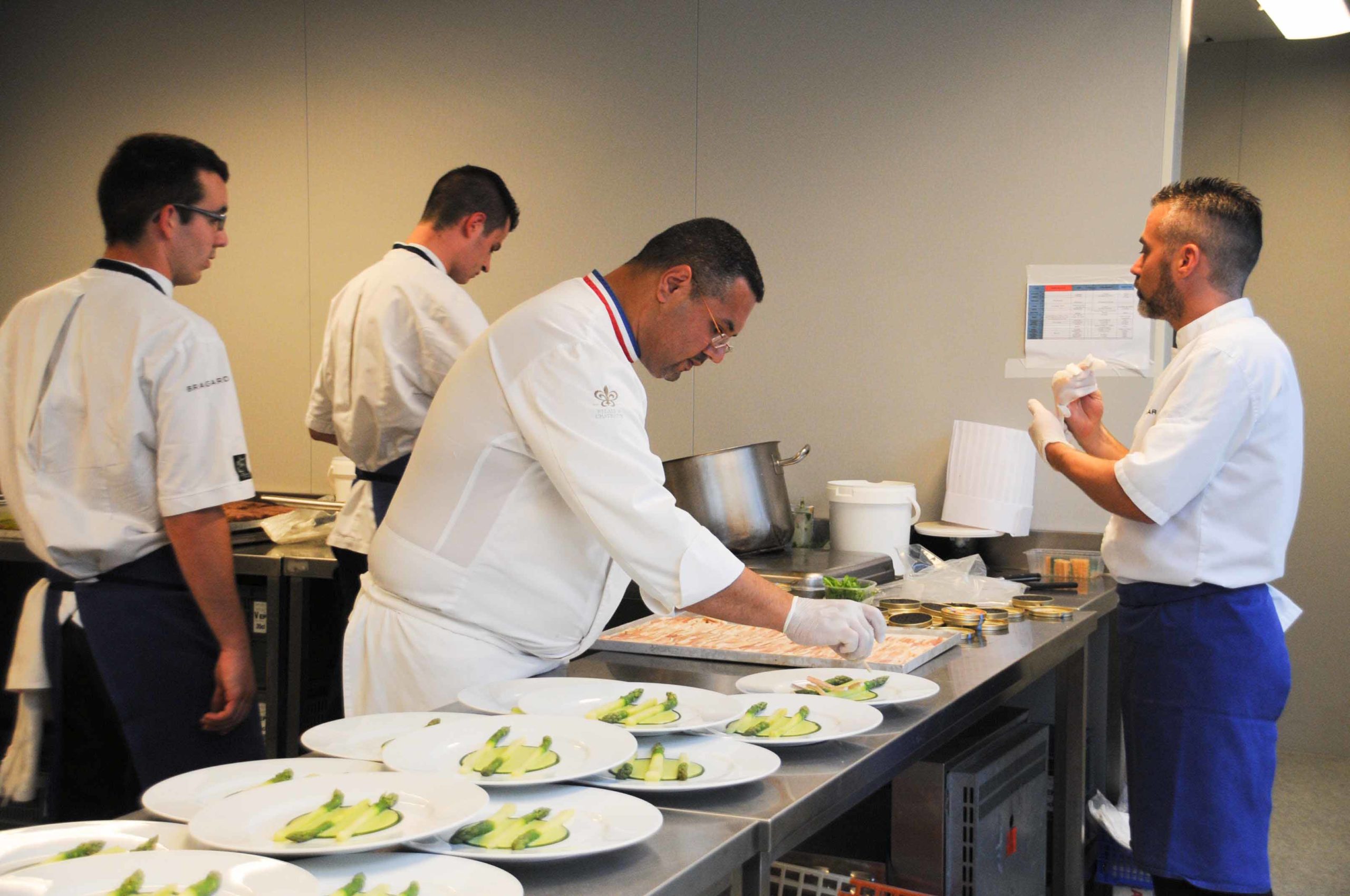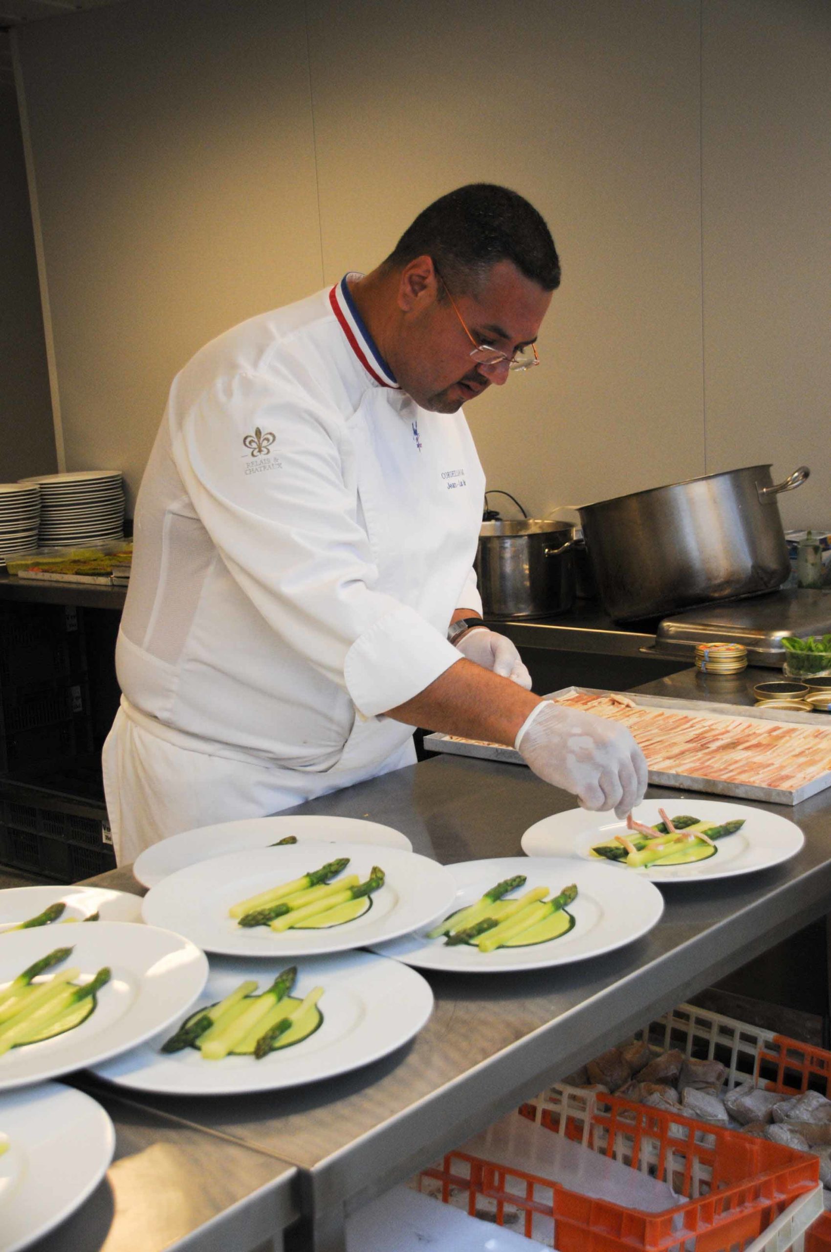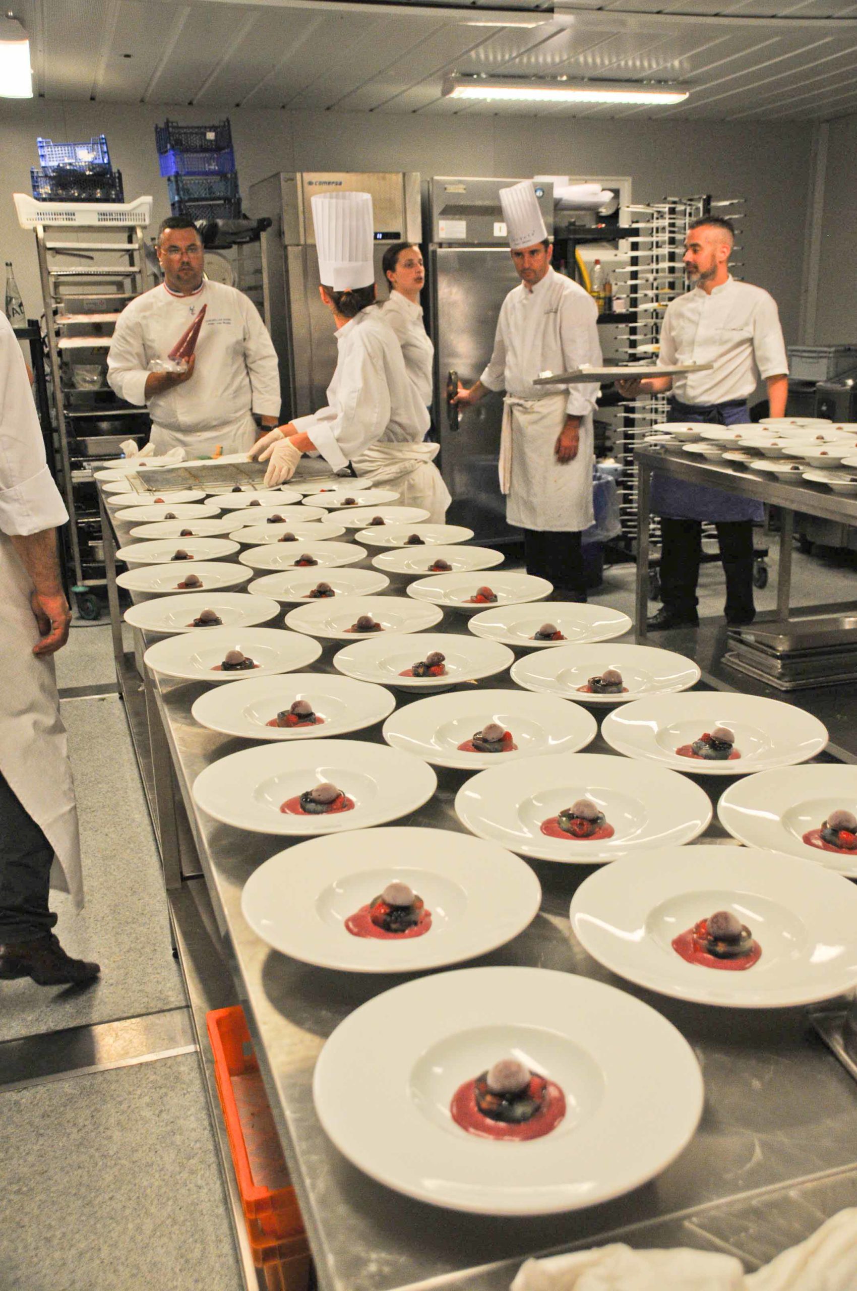 On retrouve le Chef dans les cuisines spécialement aménagées aux Etoiles d’Epicure sur les Allées de Tourny. Petite nouveauté par rapport aux années précédentes: cette année une grande baie vitrée a été installée entre la salle et la cuisine, ce qui permet aux nombreux convives (plus de 100) d’admirer Jean Luc Rocha et les autres cuisiniers s’affairer en cuisine: