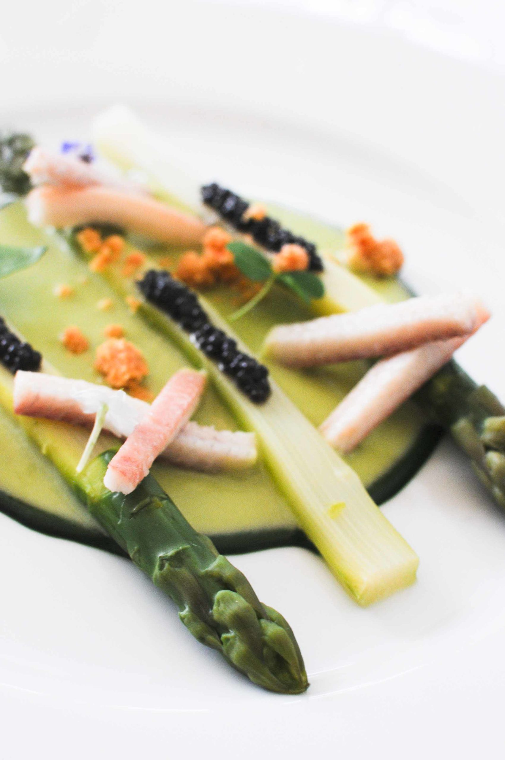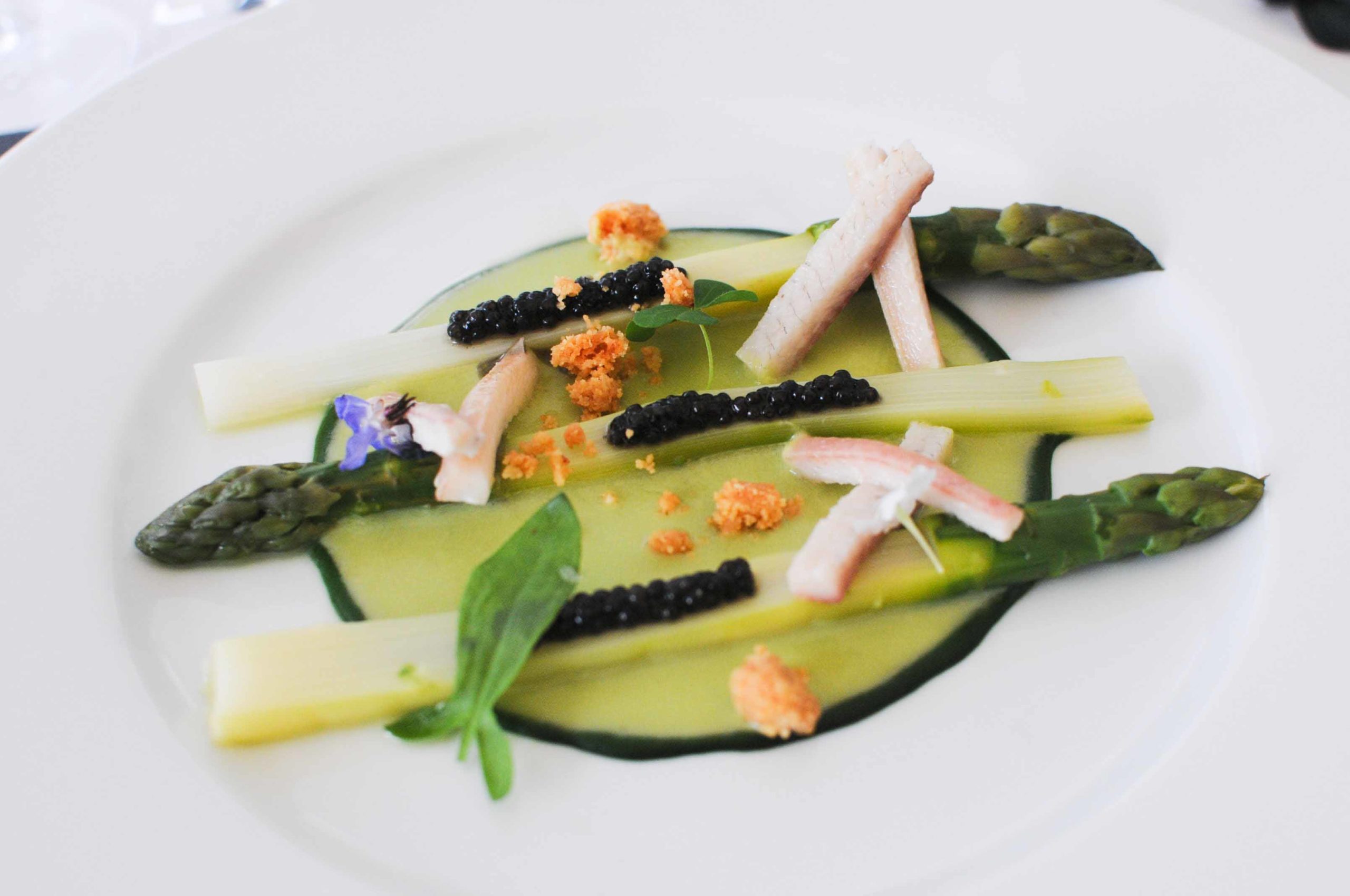 Asperges vertes, caviar d’Aquitaine et anguille fumée (accompagnée de 2 vins: Michel Lynch Blanc Organic 2012 et Château Villa Bel Air Blanc 2012)