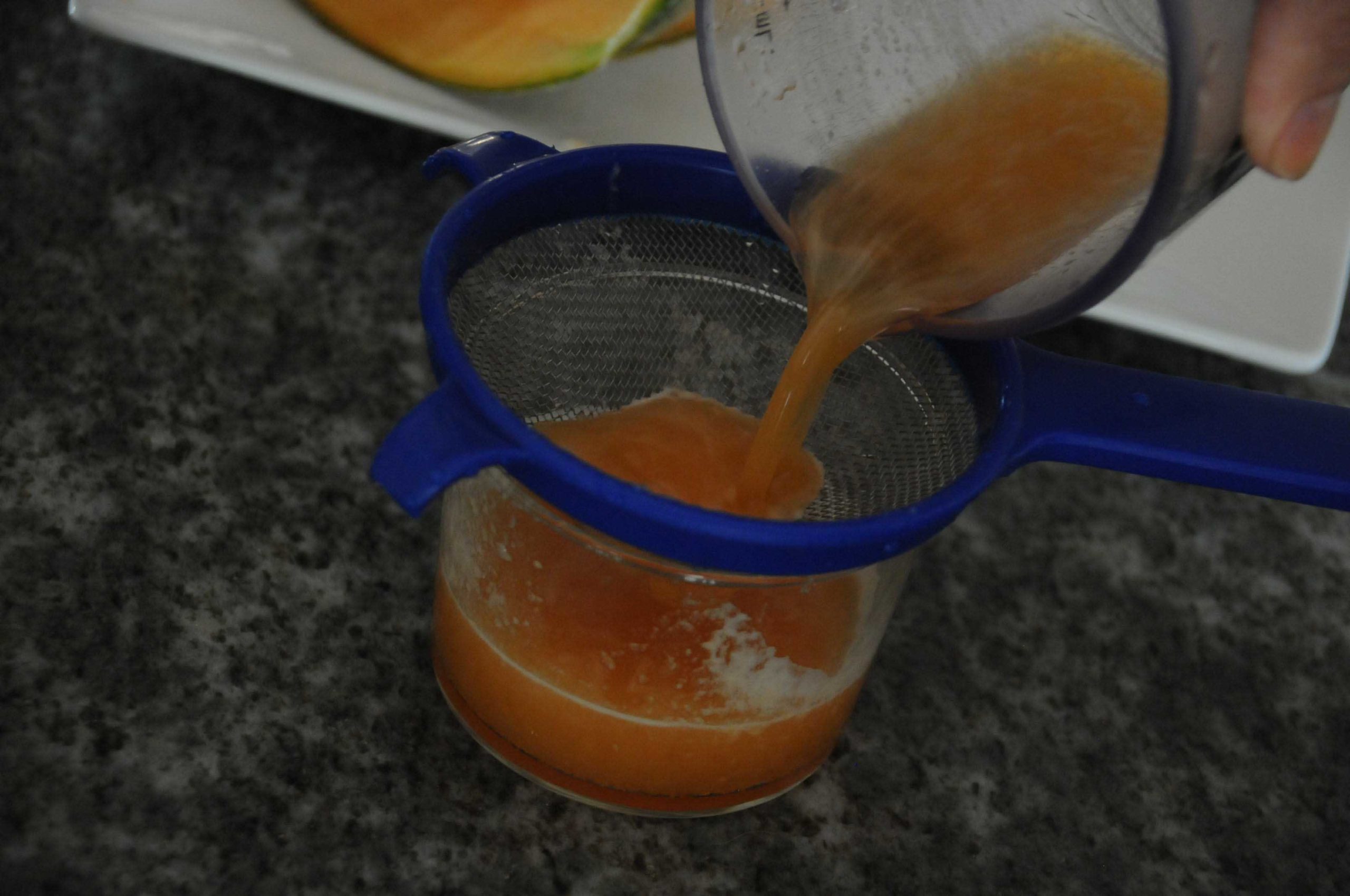 Couper le melon en 2, retirer les pépins et la peau. Passer une moitié à la centrifugeuse et récupérer le jus; ajouter le jus de citron.