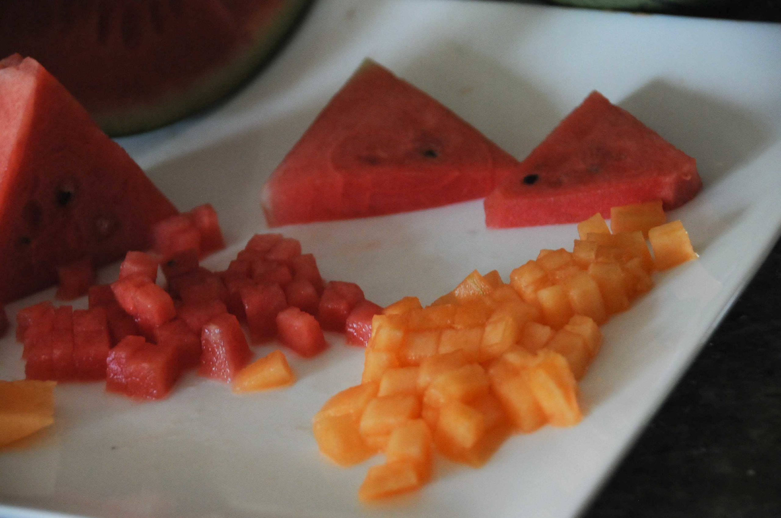 Tailler la pastèque en brunoise ainsi que le reste du melon.