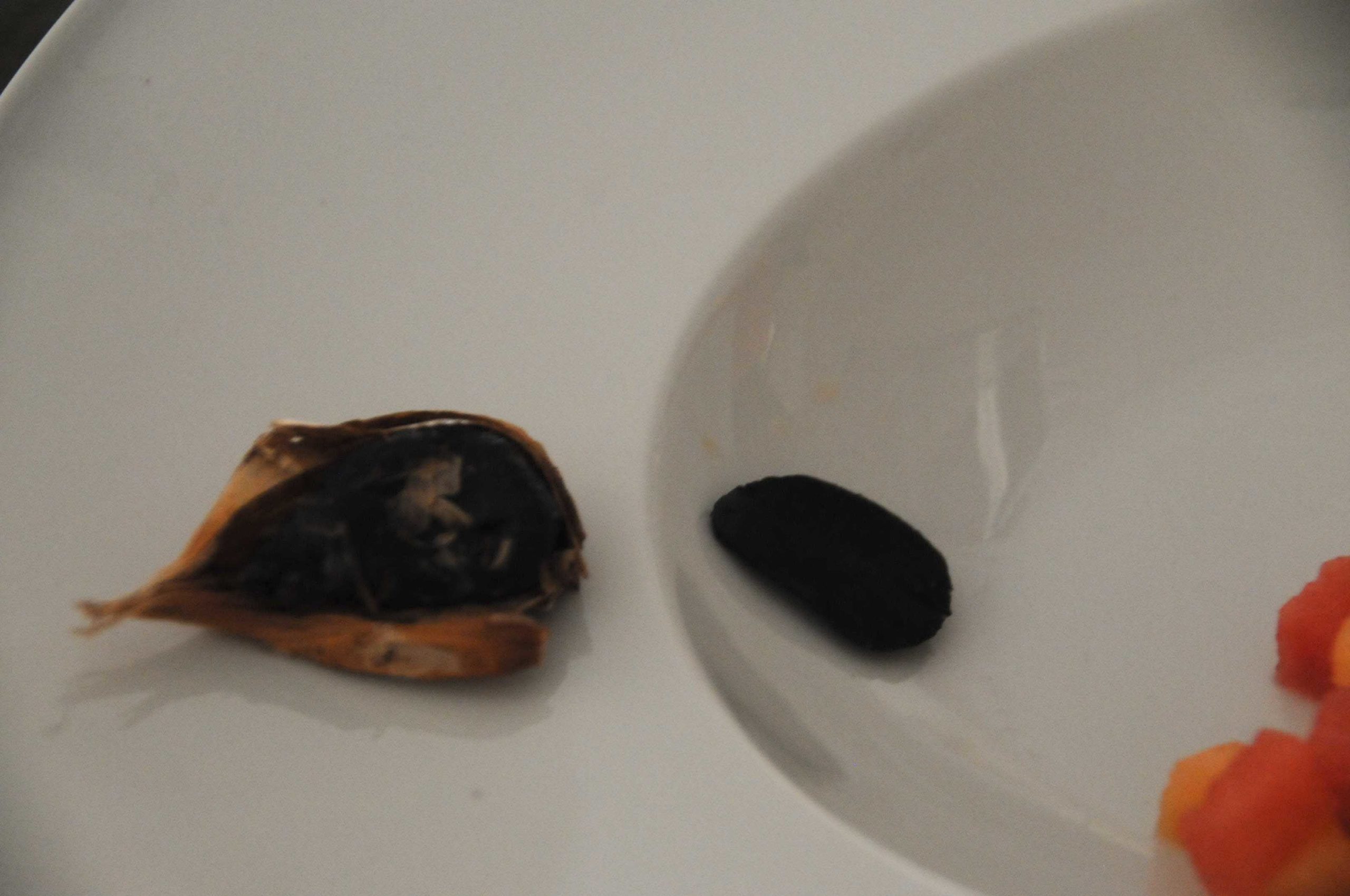 Répartir les brunoises au fond des assiettes; poser un filet de saumon dessus. Ajouter une lamelle d’ail noir sur le côté.