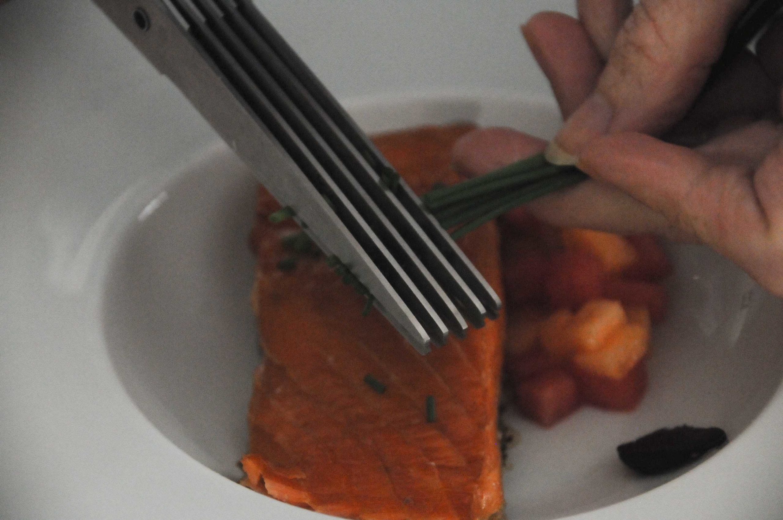 Couper les brins de ciboulette (c’est le moment de sortir vos ciseaux à herbes) . Râper le fromage de chèvre congelé sur le dessus.