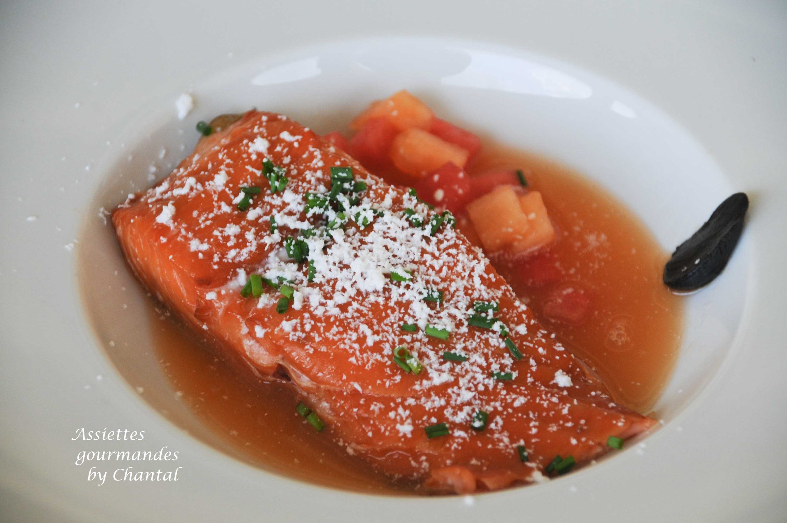 J’avais reçu il y a quelques temps du saumon de la Maison Delpierre et j’avais le souvenir d’une entrée très sympa autour du saumon et du melon l’été dernier au restaurant Passions & Gourmandises ; un melon dans le frigo, la chance d’avoir aussi de l’ail noir d’Aomori… on compose et on déguste!