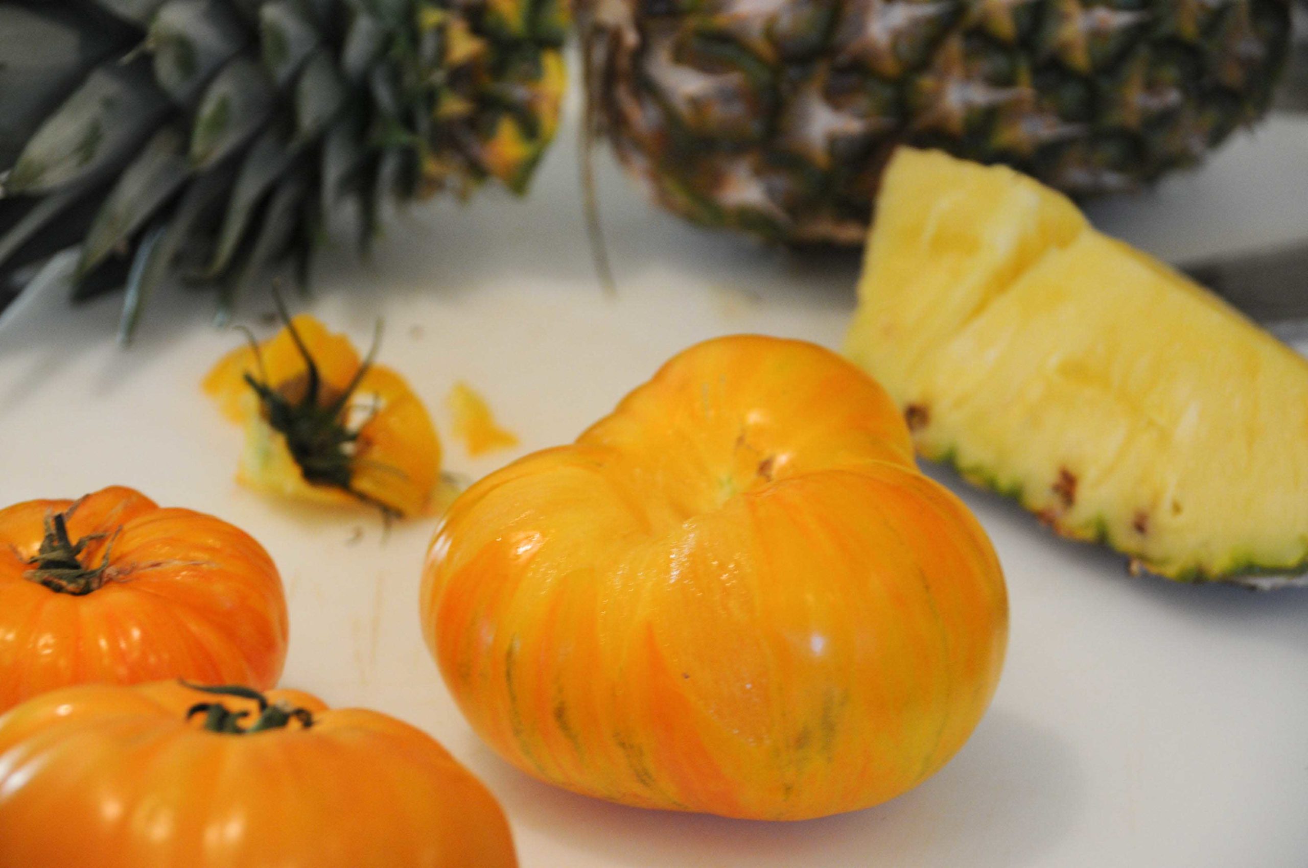 600 g de tomates ananas (tomates jaunes orangées), 300 g d’ananas
