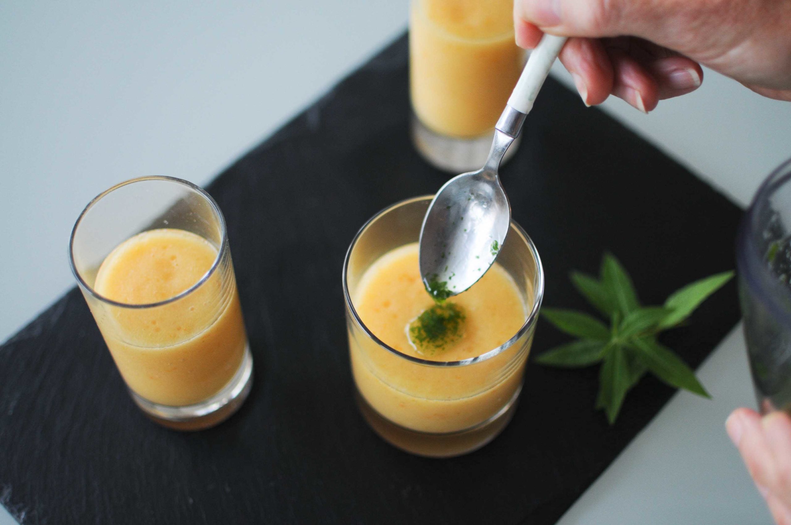 Verser le gaspacho dans les verrines, ajouter quelques gouttes d’huile de verveine et servir bien frais.