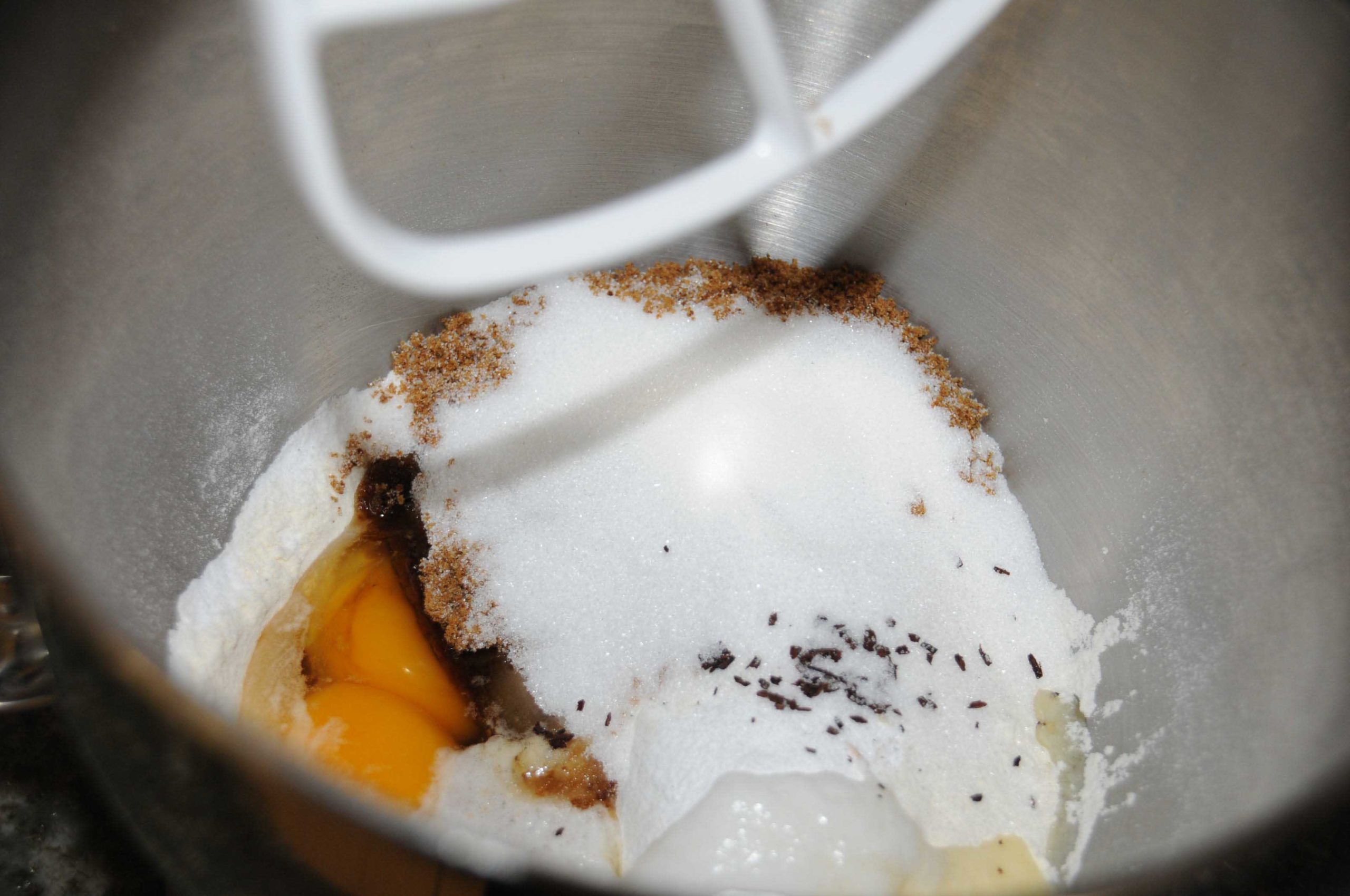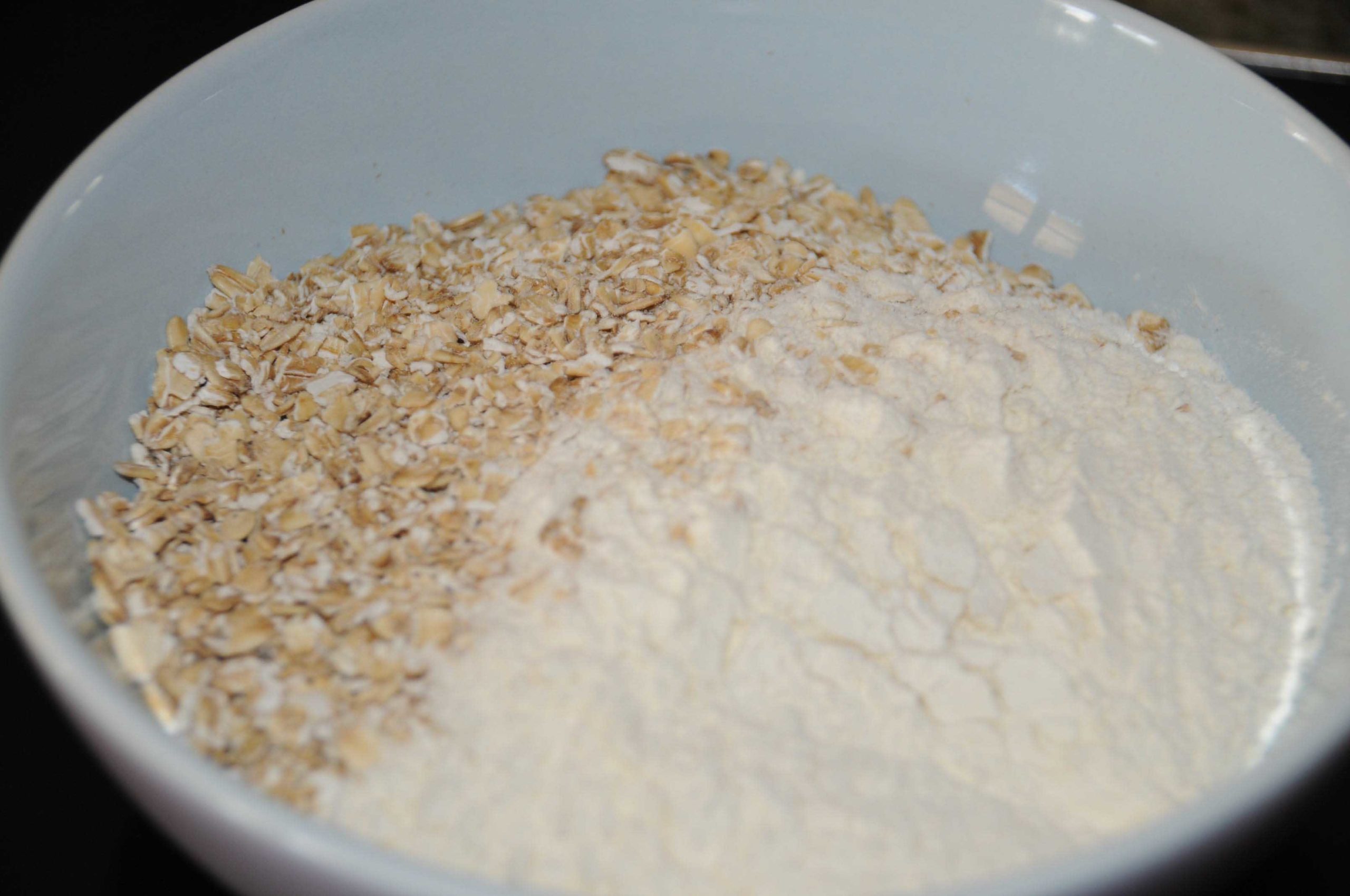 Dans un batteur, verser la farine, les flovons d’avoine, les sucres et la levure. Ajouter les oeufs, crème et huile, graines de vanille et mélanger.