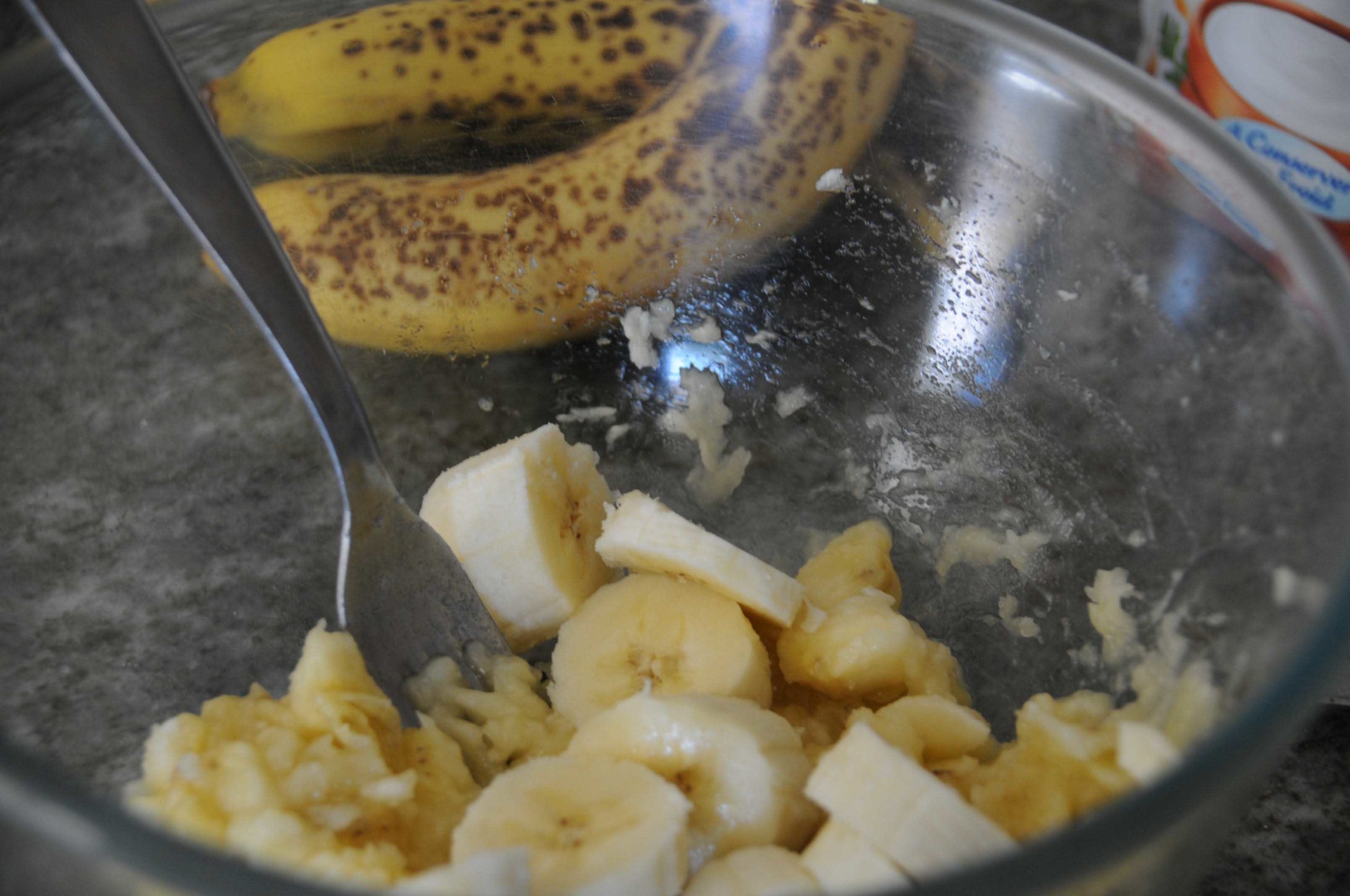 Peler et couper les bananes. les écraser grossièrement à la fourchette. Les ajouter à la préparation de base et mélanger.