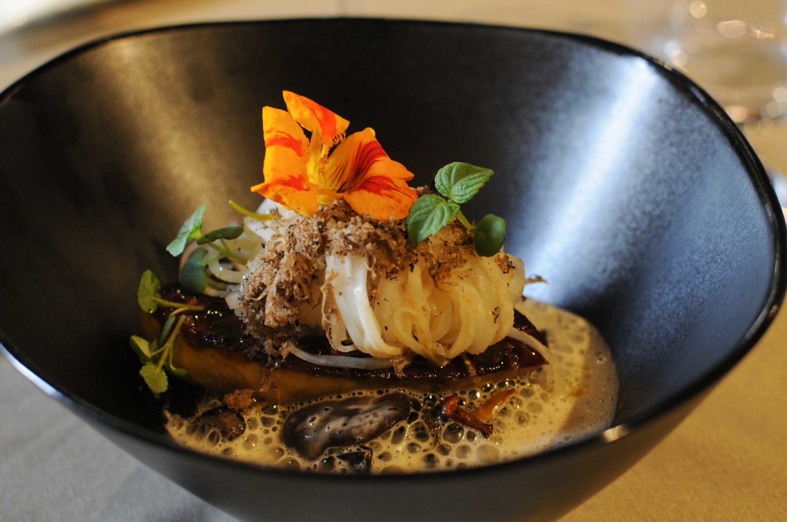 Foie Gras de nos plaines de Limagne Grillé, Champignons du Moment, Spaghettis de Céleri, Emulsion de Bouillon de Poule, Truffe d’Auvergne