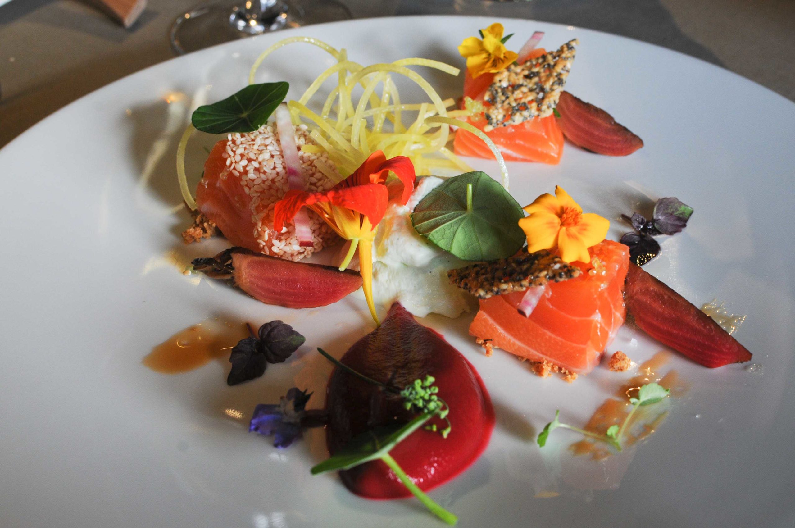 Le Saumon Label Rouge d’Ecosse Façon Gravlax, Betteraves en Déclinaison, Parfum de Wasabi, Huile de Sésame