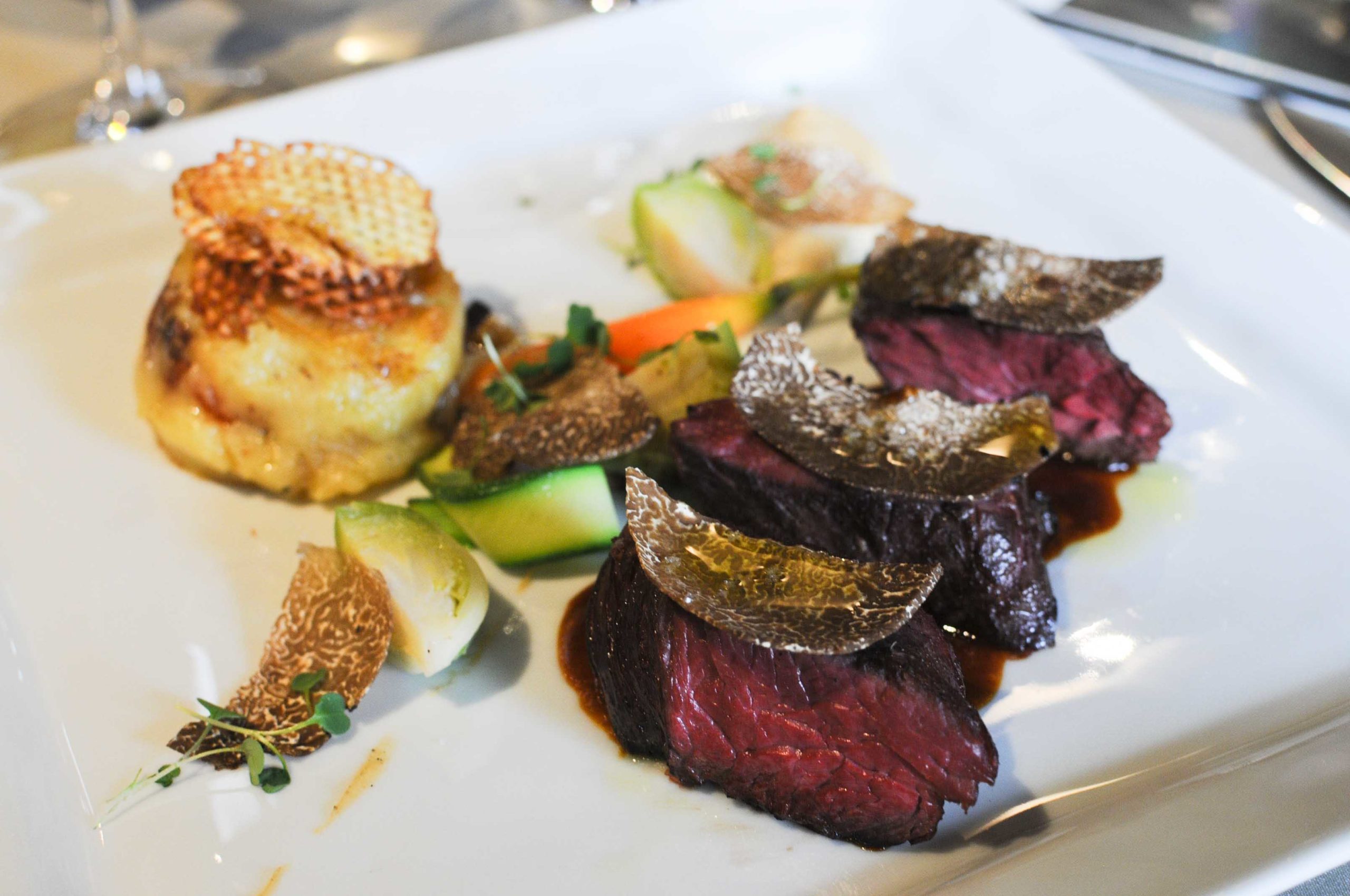 Viande tendre et juteuse, jus réduit et corsé, quelques lamelles de truffe subliment le plat… A travers ce plat on retrouve une cuisine gustative où la tradition garde certaines valeurs.