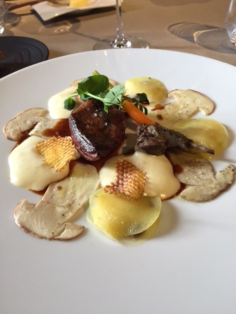 Le Pigeonneau de Racan en 2 façons : Le Filet Rôti et Servi Rosé, la Cuisse Confite, Pomme de Terre en Différentes Textures, Jus des Carcasses Corsé et Tranché à l’Huile de Café