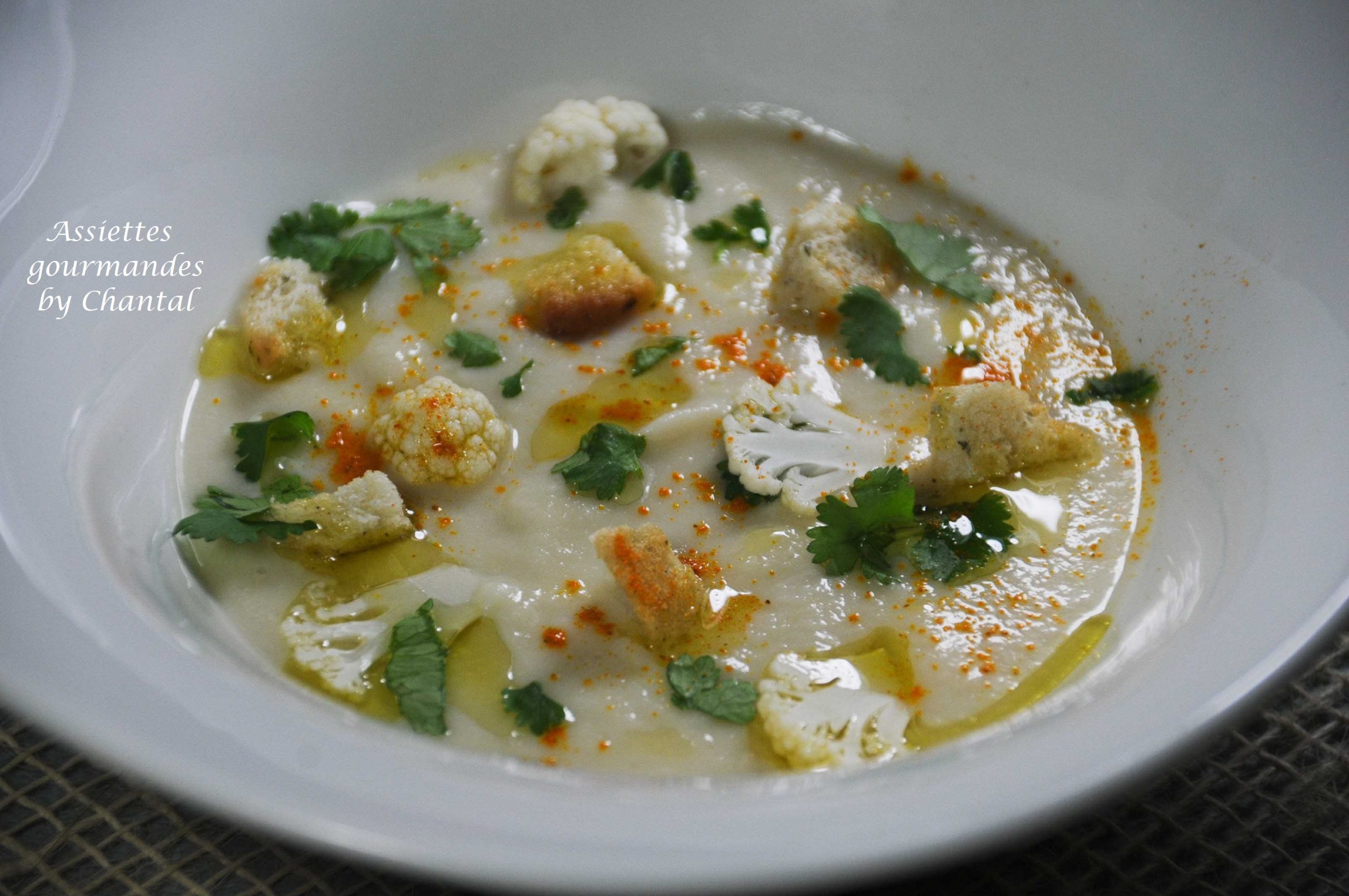 1 chou-fleur (environ 500 g), 1 échalote, 20 cl de crème de coco, 50 cl de bouillon de volaille, curcuma, sel et poivre, coriandre fraîche, 1 ou 2 cuillerées de crème épaisse, quelques petits croûtons, huile d’olive au citron