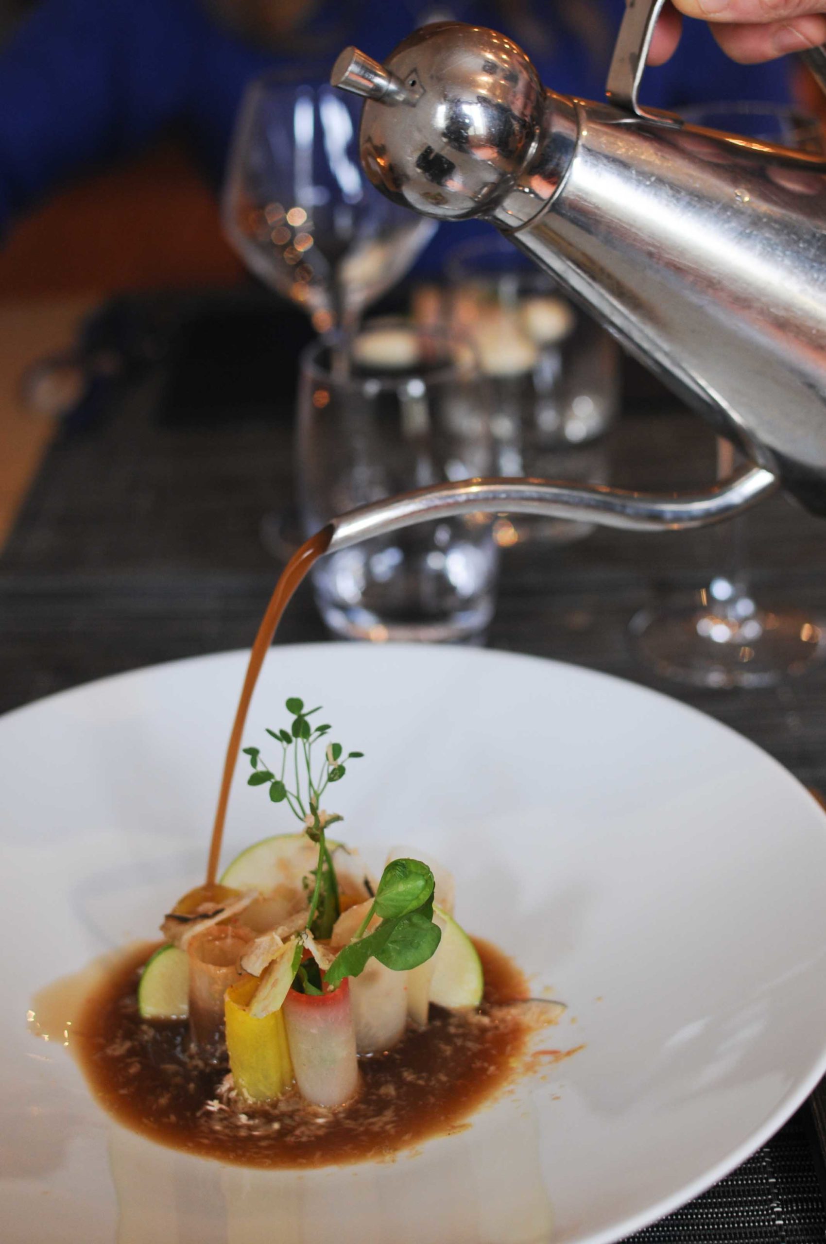 Magnifique plat autour des légumes et fruits: différentes variétés de betteraves, navet Pardailhan, panais, pomme Granny Smith, racines de persil…, le bouillon est un véritable concentré d’arômes, le foie gras fond légèrement et vient renforcer les saveurs. Une très belle assiette visuelle et gustative.