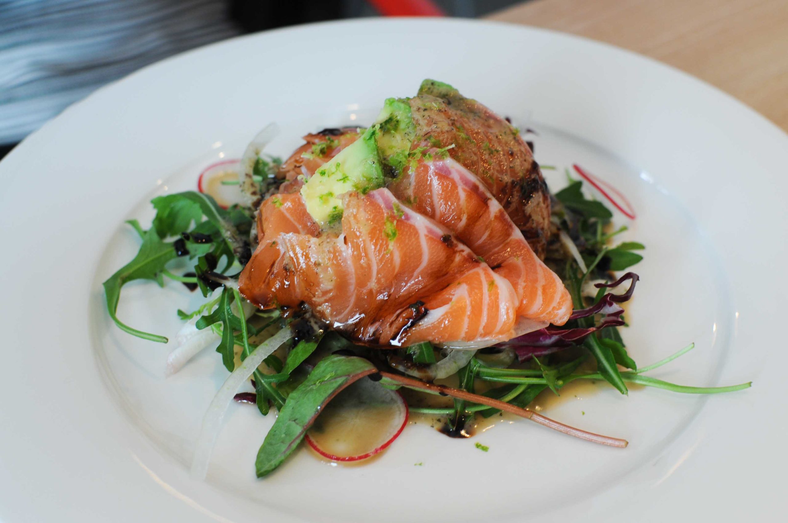 Le saumon est servi cru accompagné de lamelles d’avocats, mesclun et d’une sauce shiso, pomme…. et pas mal d’autres choses je suppose… divin! C’est frais, très aromatique, une excellente assiette !