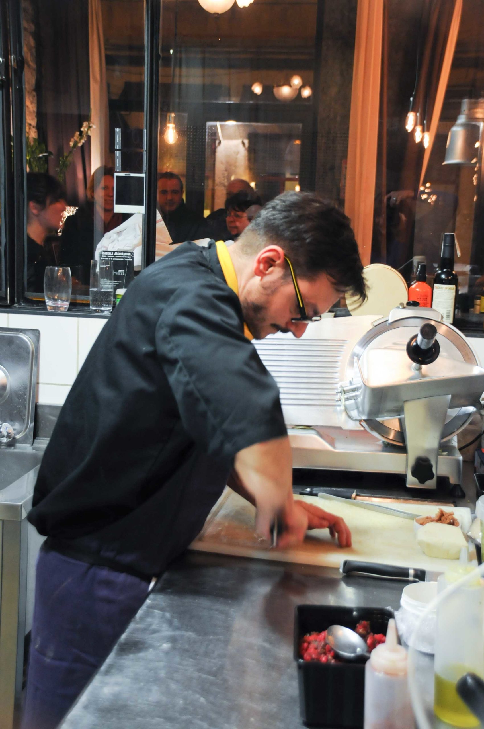 Tout au long du repas, vous pouvez voir le Chef Hubert Vergoin s’activer dans la cuisine largement ouverte sur la salle: