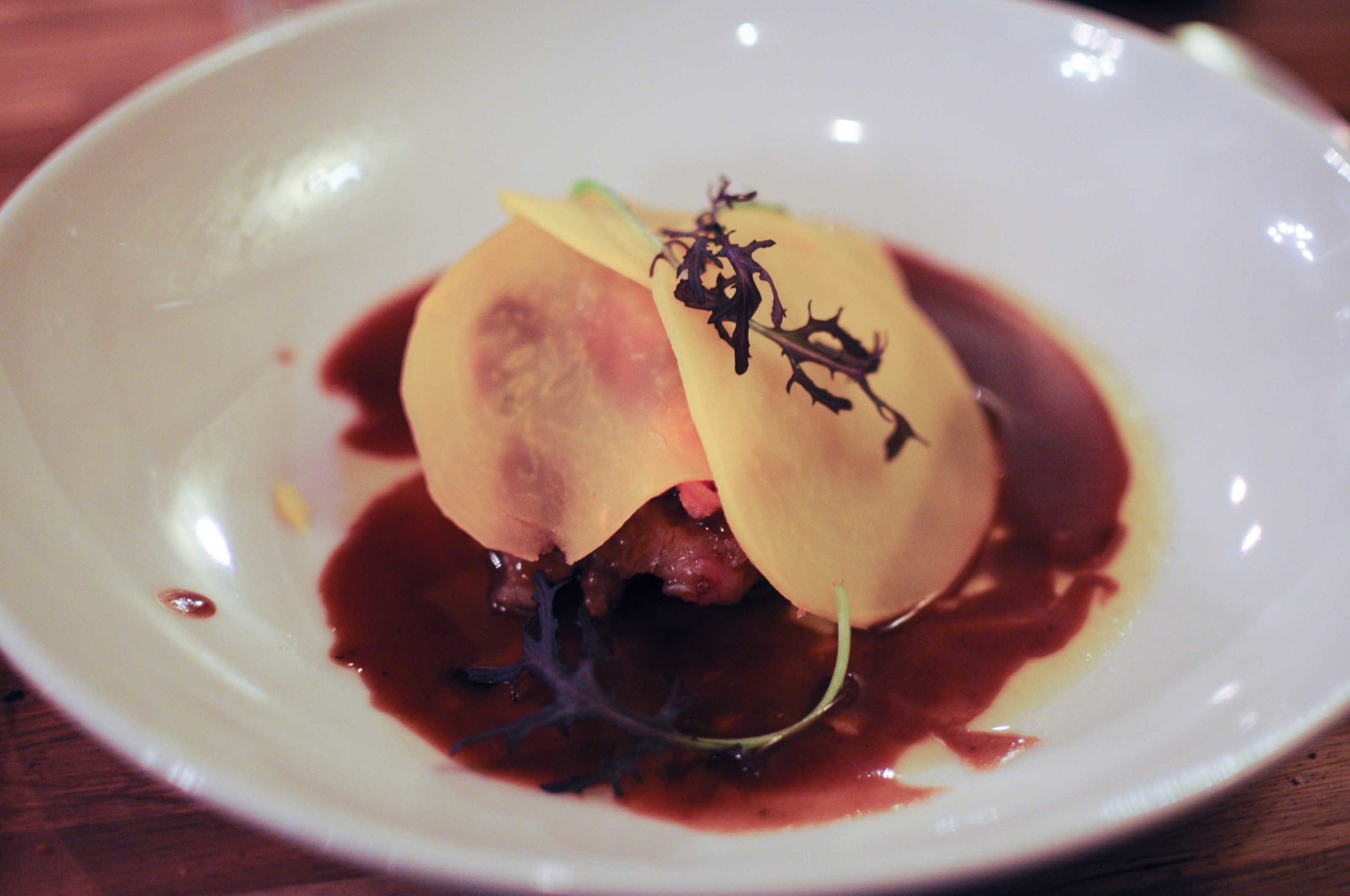 Agneau confit une nuit, oeufs de cabillaud fumés, jus corsé au pain d’épices, rutabaga
