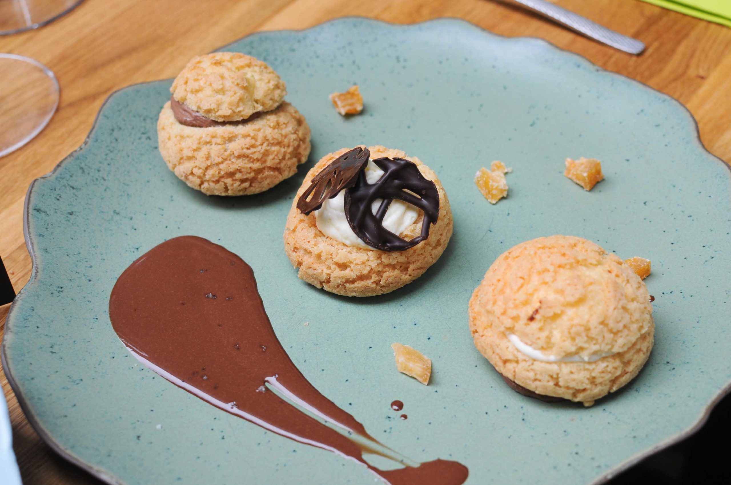 Choux croustillant, crème chocolat, crème fève Tonka, mousse gingembre