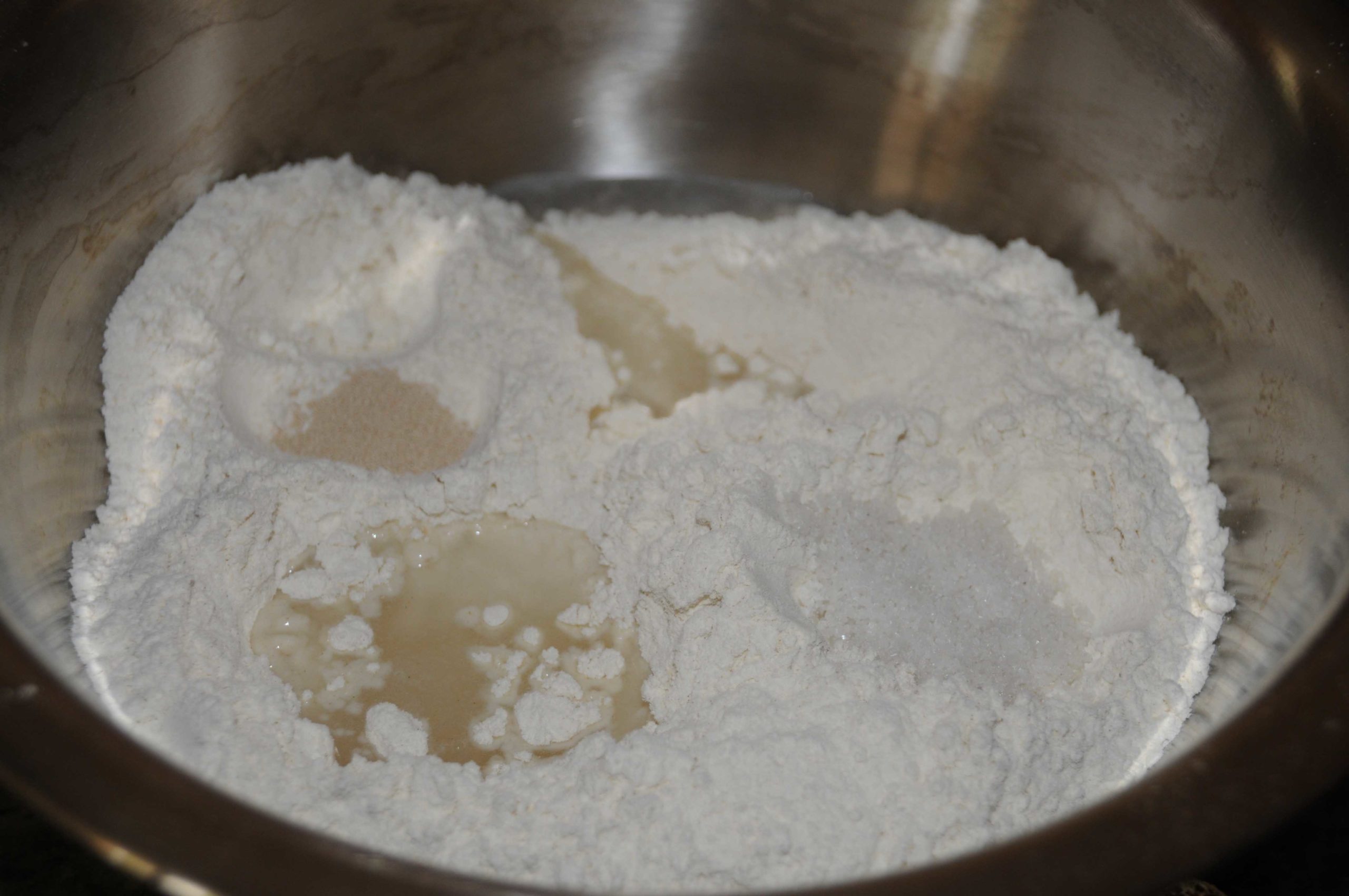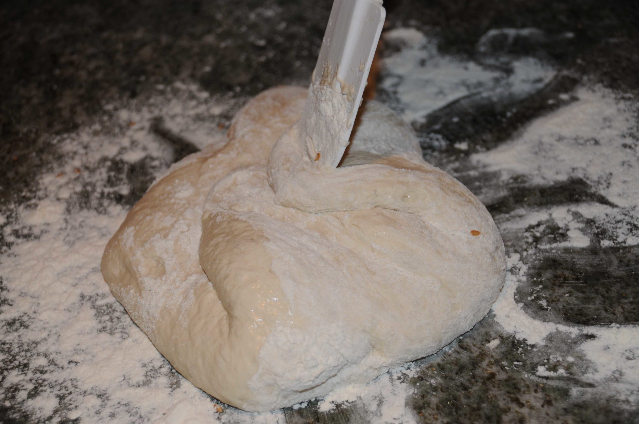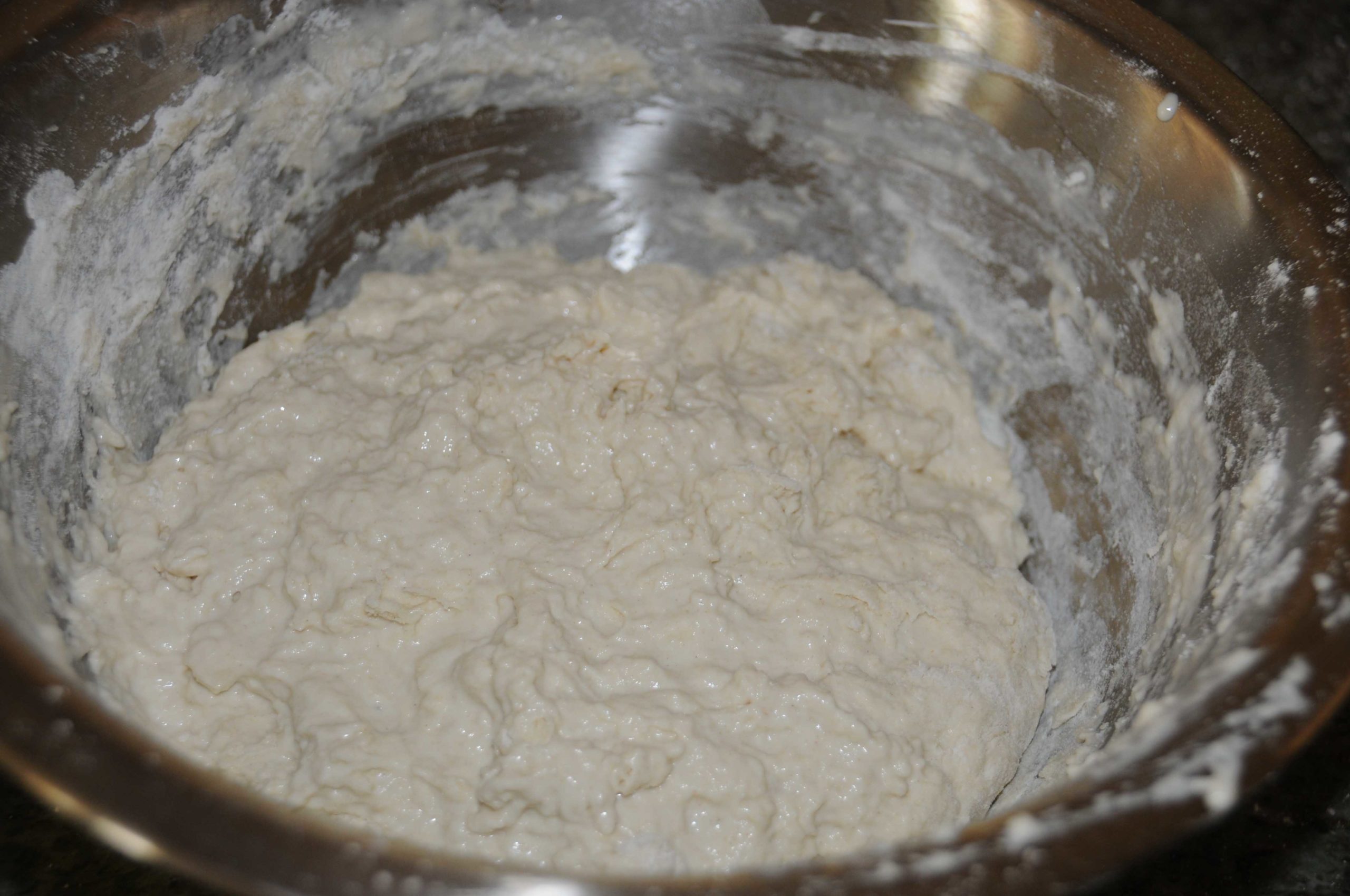 Mettre la farine, le sel, la levure dans un saladier. Verser l’eau et mélanger rapidement l’ensemble. La pâte doit être très mouillée (on peut rajouter quelques cuillerées d’eau si ça semble trop compact),  très collante et honnêtement elle a une drôle d’allure ^_^ Don’t worry!