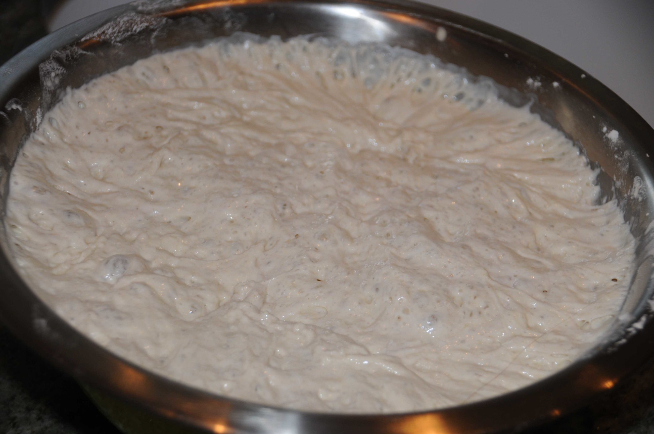 La pâte doit avoir levé et on peut voir une multitude de petites bulles en surface.