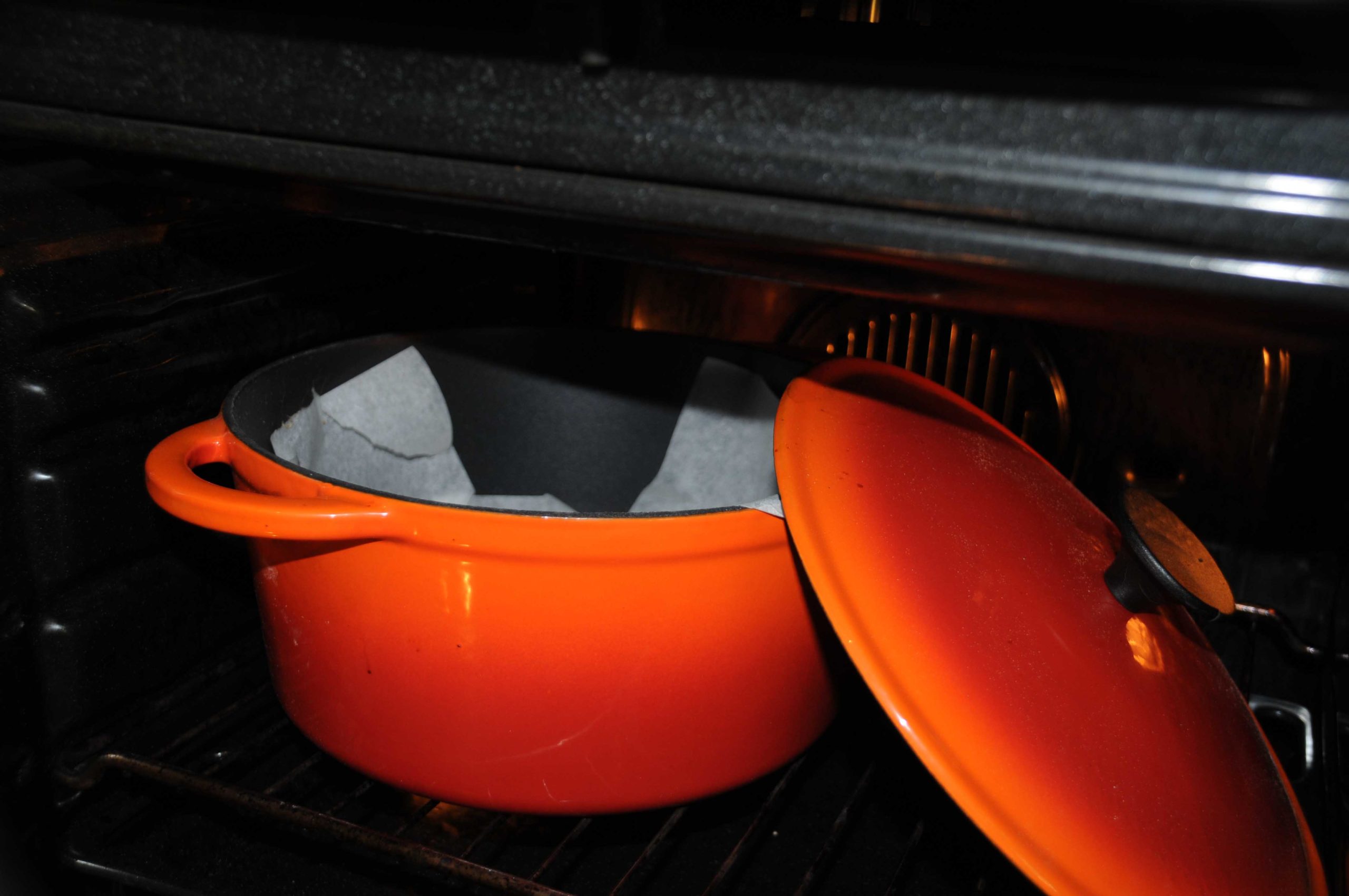Préchauffer le four à l’avance à 250 °C pendant 45 minutes avec la cocotte vide placée à l’intérieur.