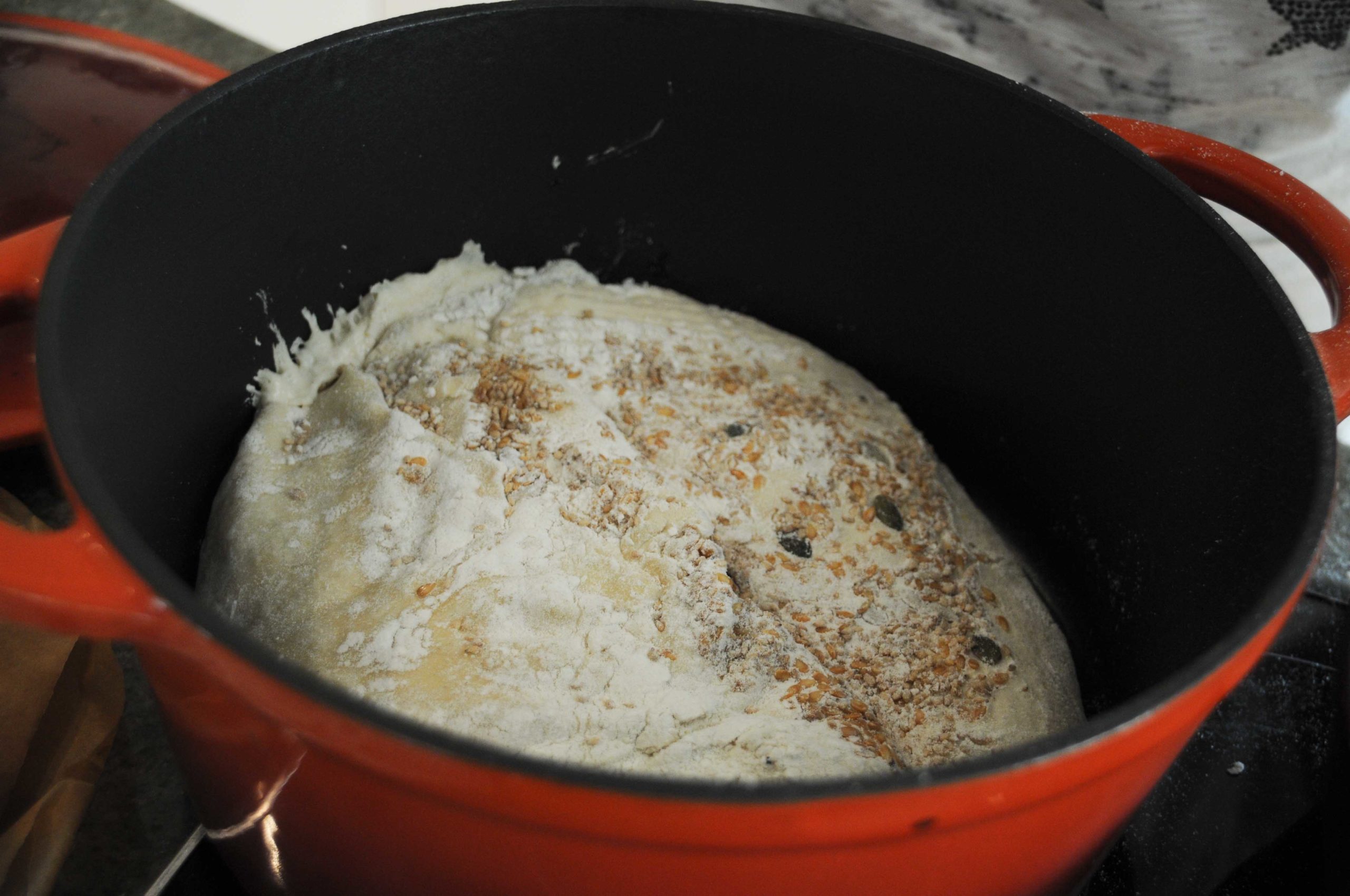 Placer un torchon dans un récipient d’environ le même gabarit que la cocotte qui ira au four pour la cuisson du pain. Verser quelques graines et saupoudrer de farine.