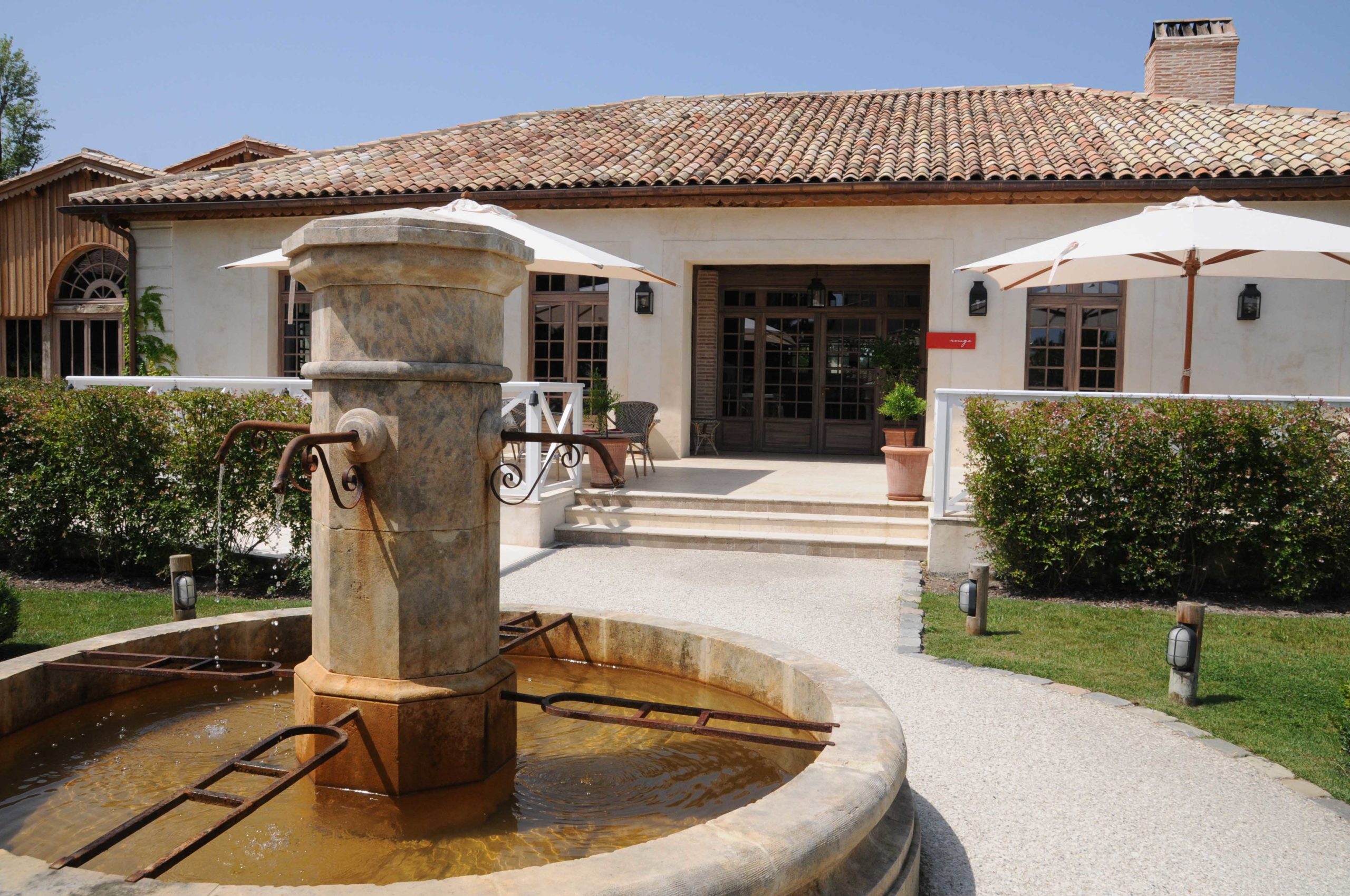 Il ne reste qu’à traverser le vignoble pour rejoindre Les Sources de Caudalie pour un déjeuner à la Terrasse du Bar / épicerie « Rouge », le dernier né des 3 lieux de restauration des Sources de Caudalie.