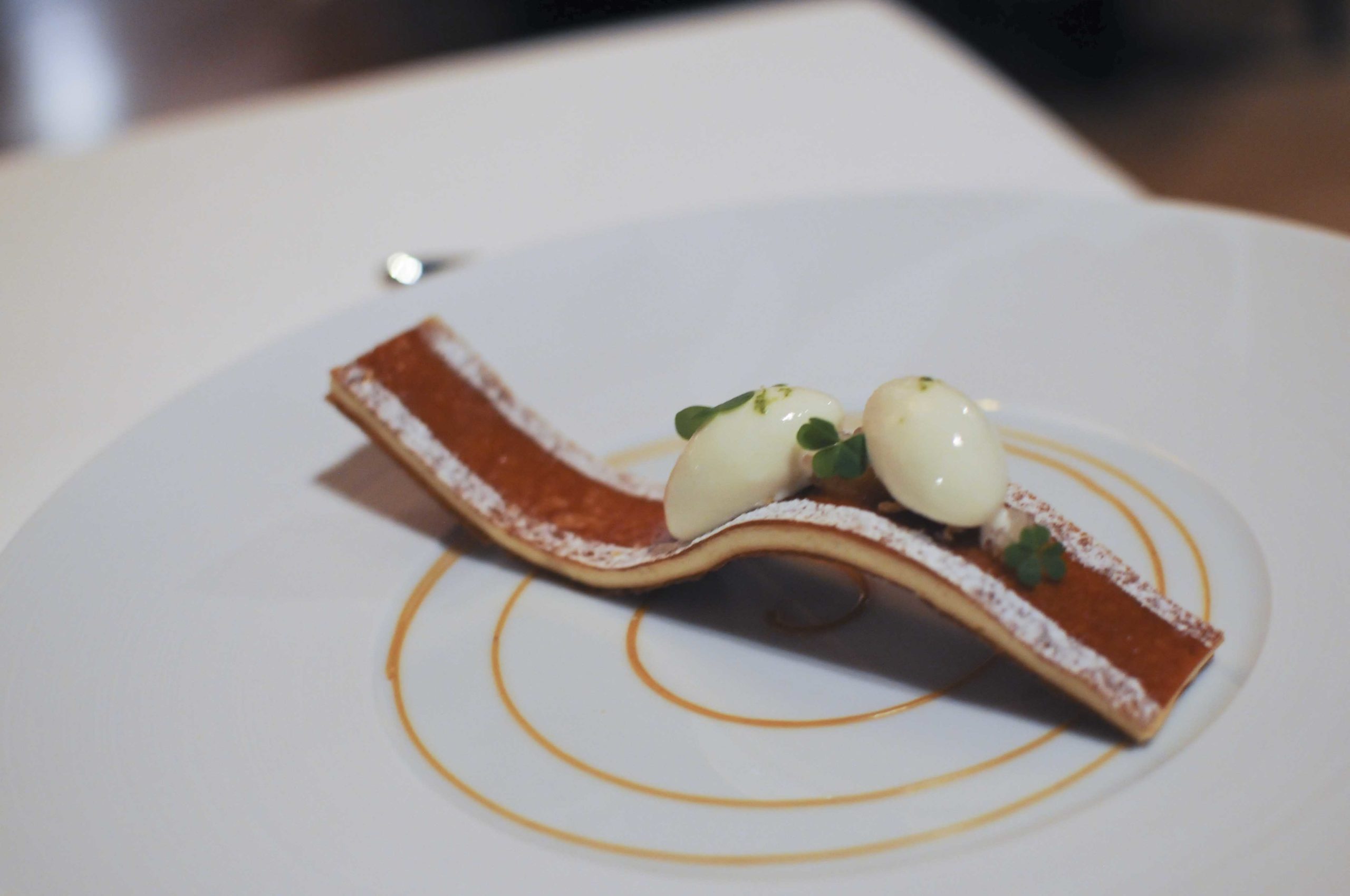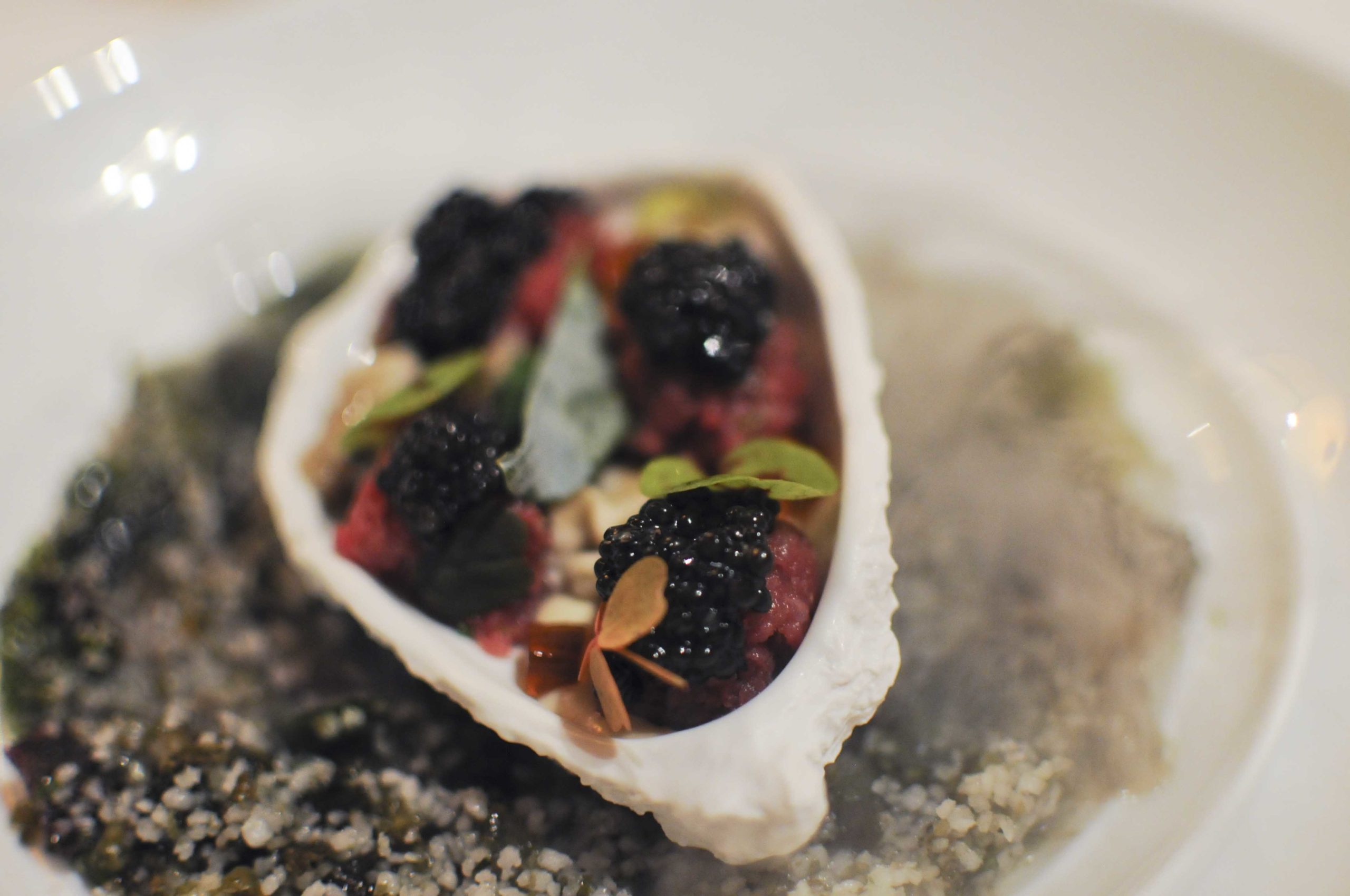 Pour un effet visuel garanti, l’assiette est servie avec de la glace carbonique qui donne une impression de brouillard autour de la coquille d’huître. Au fond de la coquille, la crème d’huître fait penser à une pannacotta pleine d’onctuosité, l’iode et le boeuf font très bon ménage, une entrée d’une grande finesse et d’un équilibre parfait.