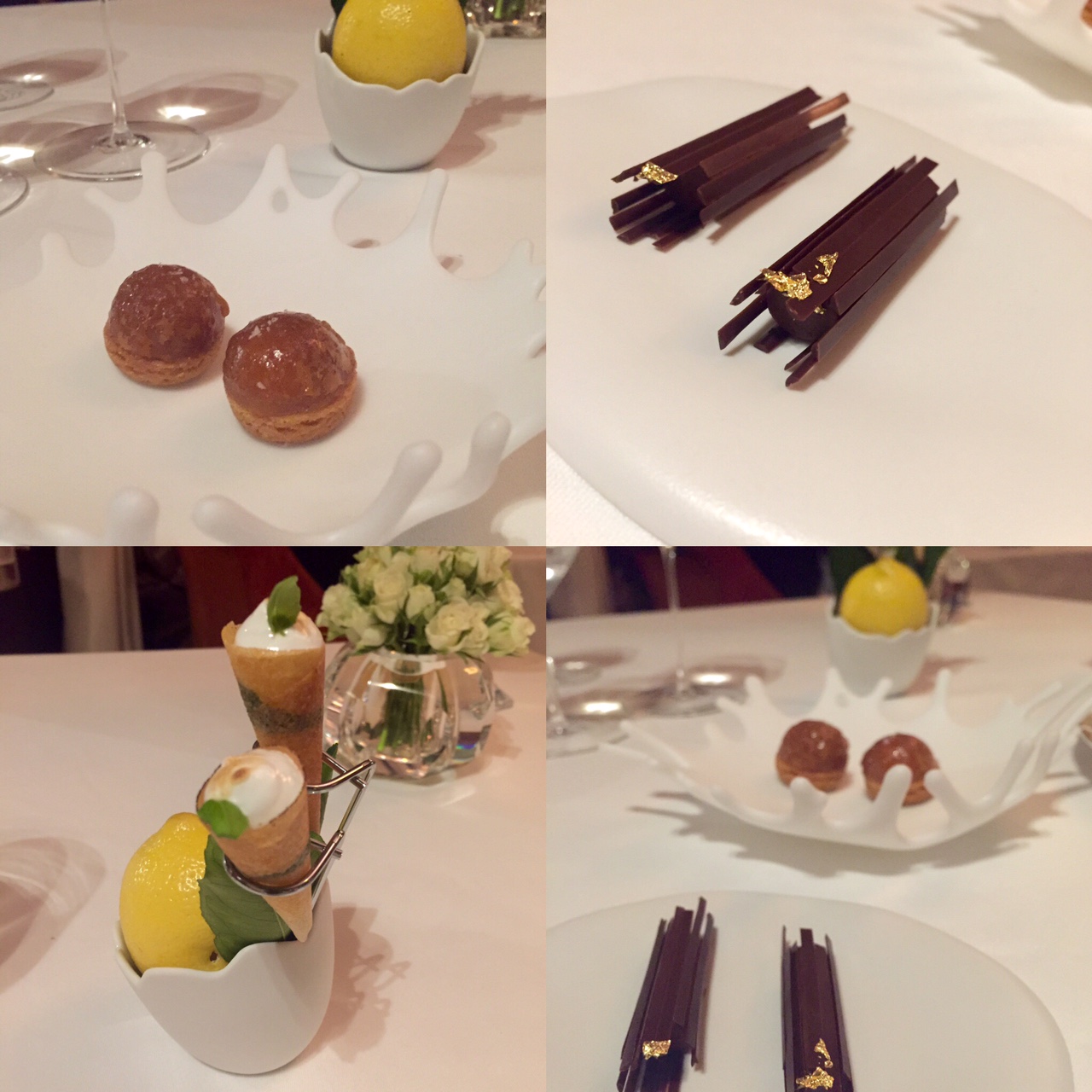 Tarte Tatin sur sablé breton; cornet citron meringué; fuseaux chocolat